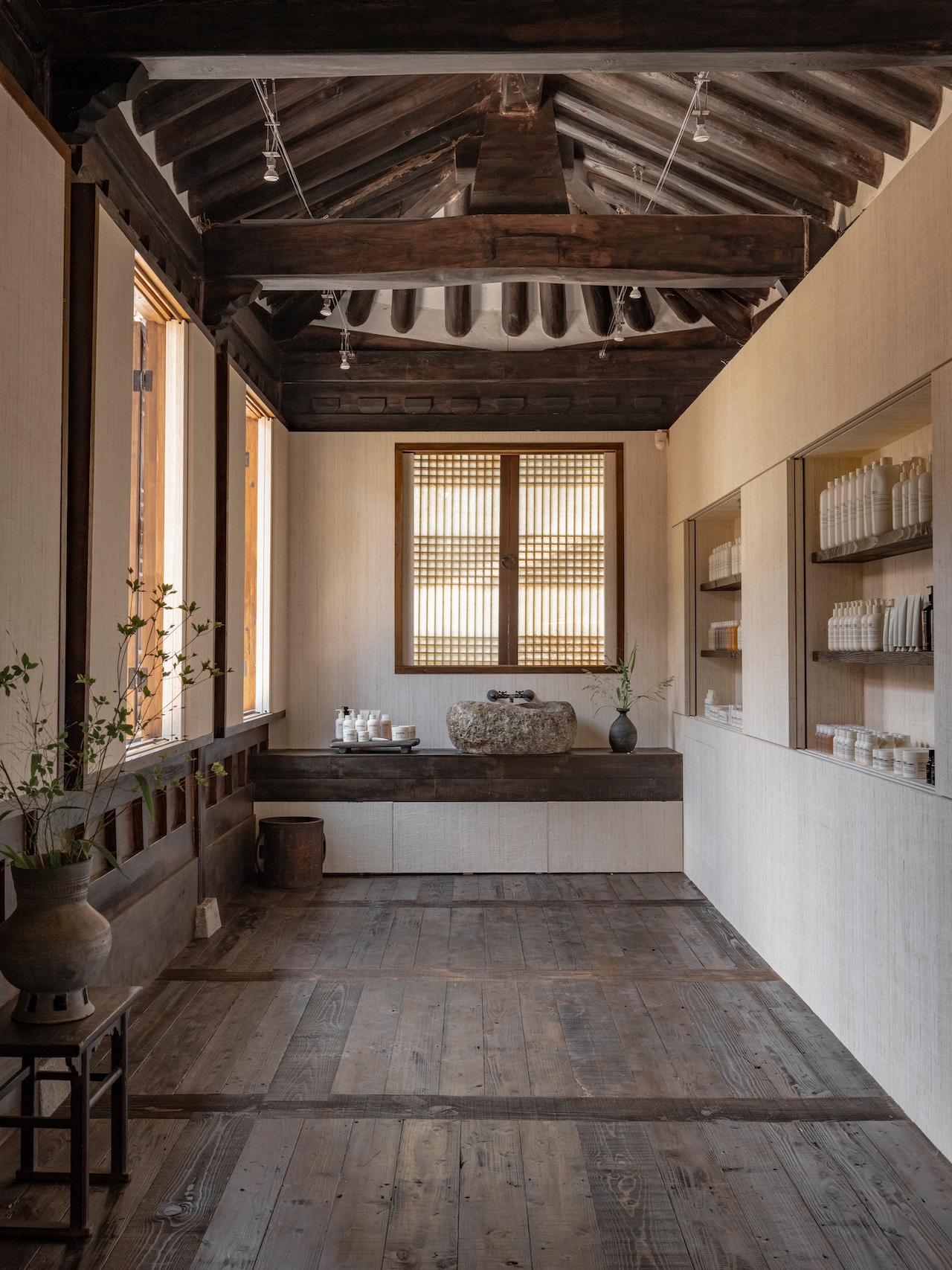 This Seoul outpost represents something more than contemporary design practice – it is a seamless integration of traditional Korean craft techniques with modern sensory methodology. The designers approached the historic hanok not as a museum piece to be preserved under glass, but as a living framework capable of supporting contemporary making. The original stonework remains untouched, its weathered surfaces providing textural counterpoint to newly installed wooden floors. These floors build on tradition, creating new patterns that speak in the same visual language while serving modern functions.