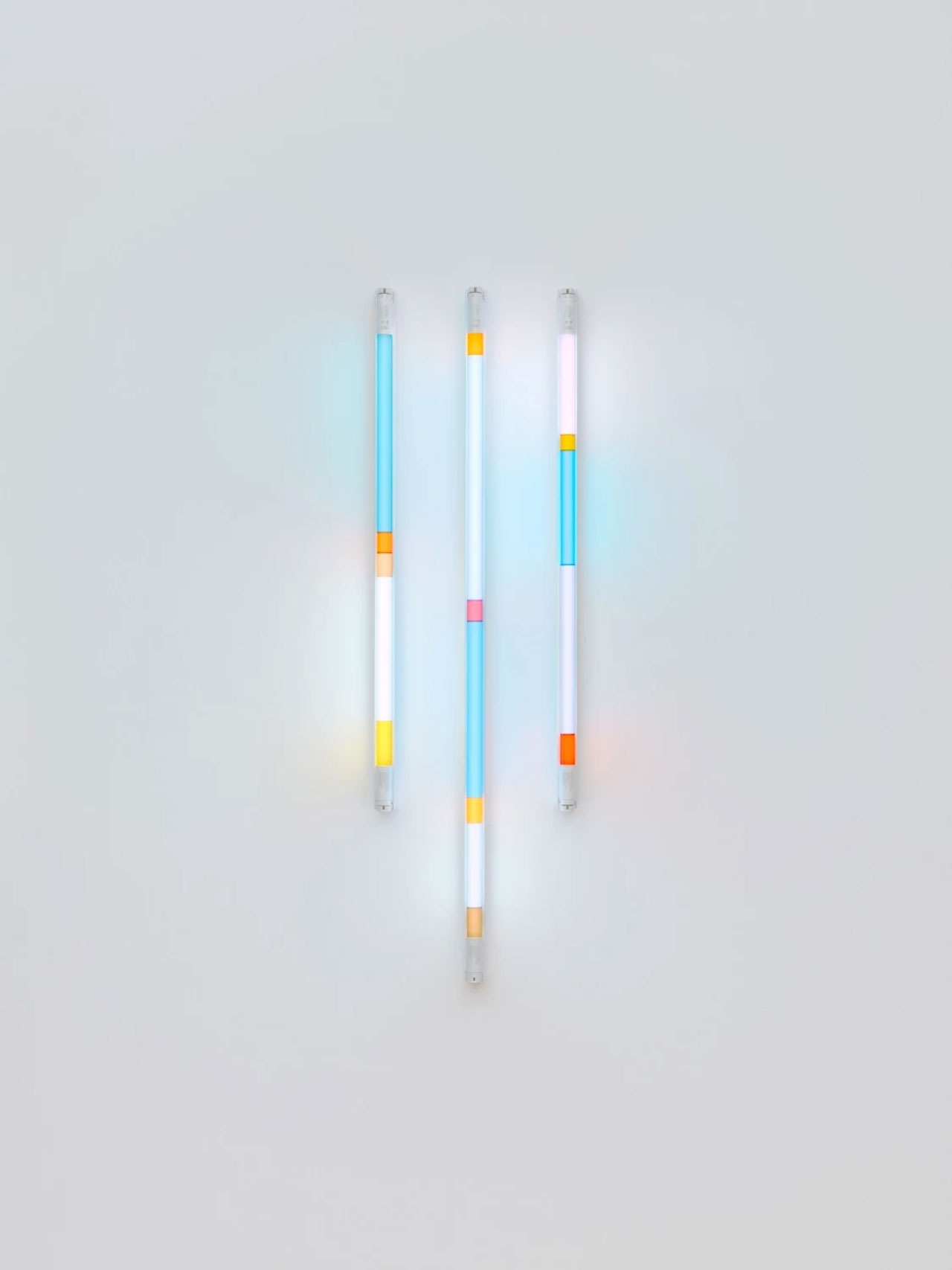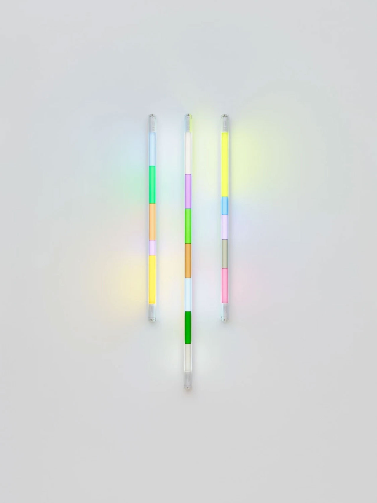 Four light sculptures span the entrance wall. All from Finch’s “haiku series,” each consists of three vertical LED lights (resembling fluorescent light tubes) wrapped in colorful filters. The total combination of light that each casts into the room perfectly matches the daylight from a different time and place, measured by the artist. The works on view here are each from a different season – winter through autumn – allowing you to walk through the light of a full year in a single hallway. Each also contains visual hints to that time and place, like in the “Autumn” work (below) for example, where the small orange sections recall falling oak leaves. The three-column shape is inspired by the Japanese haiku in both its verticality and the number of colors in each – using the “5,7,5” syllabic rules of the poetry format and including exactly 17 sections. In other words, each of these is a haiku poem that uses color rather than syllables to result in a total light projection that matches a precisely measured moment in time.