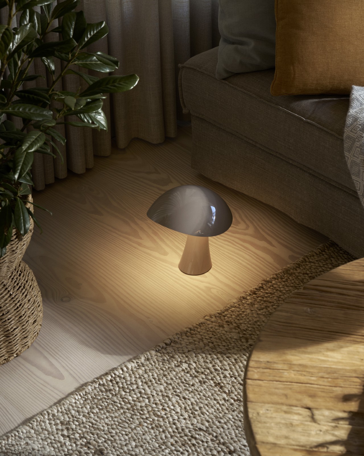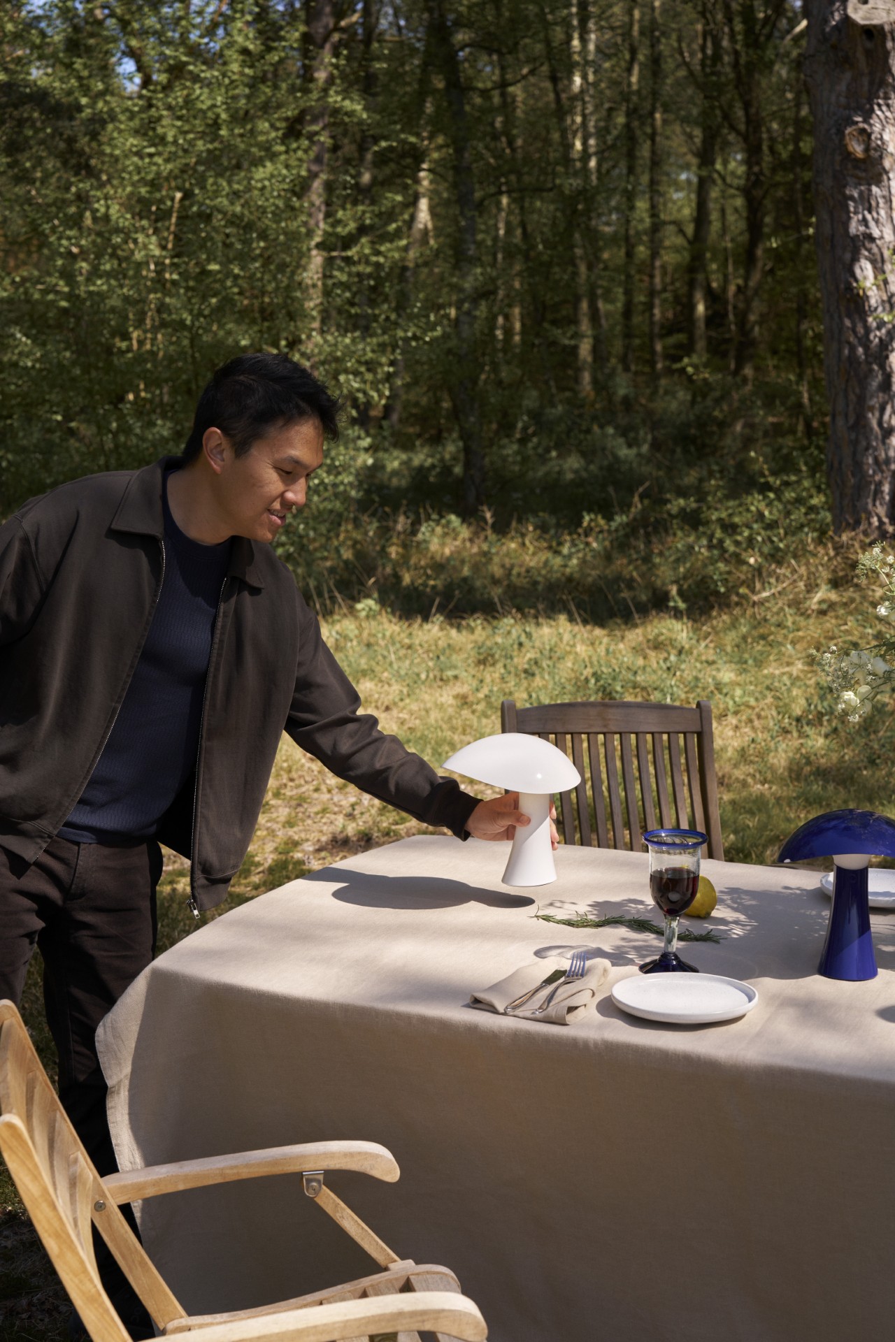 Rumee’s design expresses this human connection through form and tactility. As a portable lamp, it has an intuitive shape – one that makes you instinctively reach for the slender half of its stem, while the wider base confidently grounds it once placed. As you carry it, your eye naturally traces its soft, fluid curves, inspired by the silhouette of a broad-brimmed hat, inviting curiosity about what lies beneath. Its name, partially derived from the Danish word for room (rum), speaks to the light’s quiet affinity for closeness – it’s designed to stay near, wherever you go. “I’m really pleased with Rumee and use it as my bedside reading lamp,” Tan shares. “I like that when you hold the organic stem of Rumee, it feels nice and has an emotional quality that invites you to explore its form with your hands.”