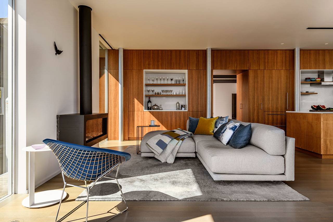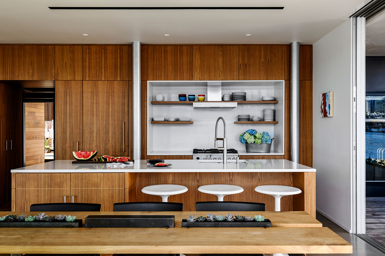 The interiors echo the maritime setting through teak cabinetry, white oak floors, and carefully crafted cabinetry that doubles as architectural transitions between spaces. The warm, natural finishes bring a sense of timelessness while reinforcing the home’s connection to the boating community.