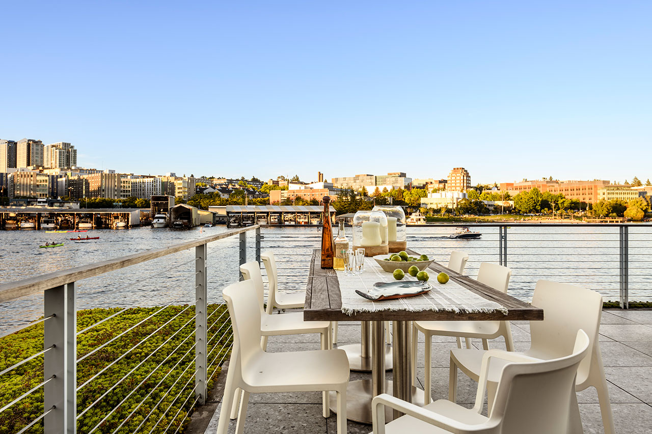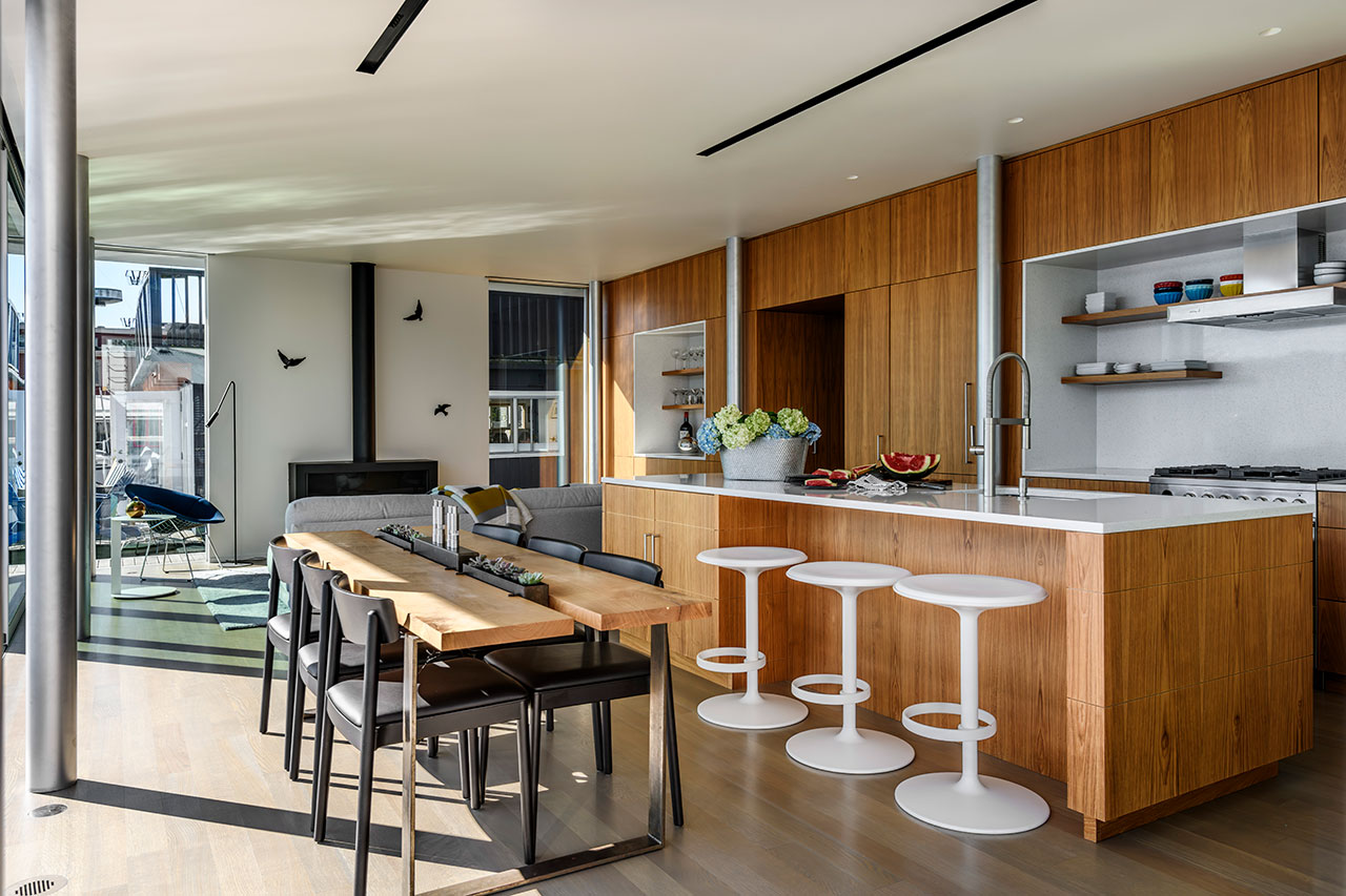 At 1,780 square feet of interior space with an additional 820-square-foot rooftop deck, the home prioritizes efficiency and adaptability. Its clean rectangular form makes the most of its footprint, while walls of glass on the main level dissolve the boundary between indoors and out on three sides of the residence. From sunrise over Lake Washington to boat traffic along Lake Union, every room is designed to engage with the ever-changing scenery of Portage Bay.