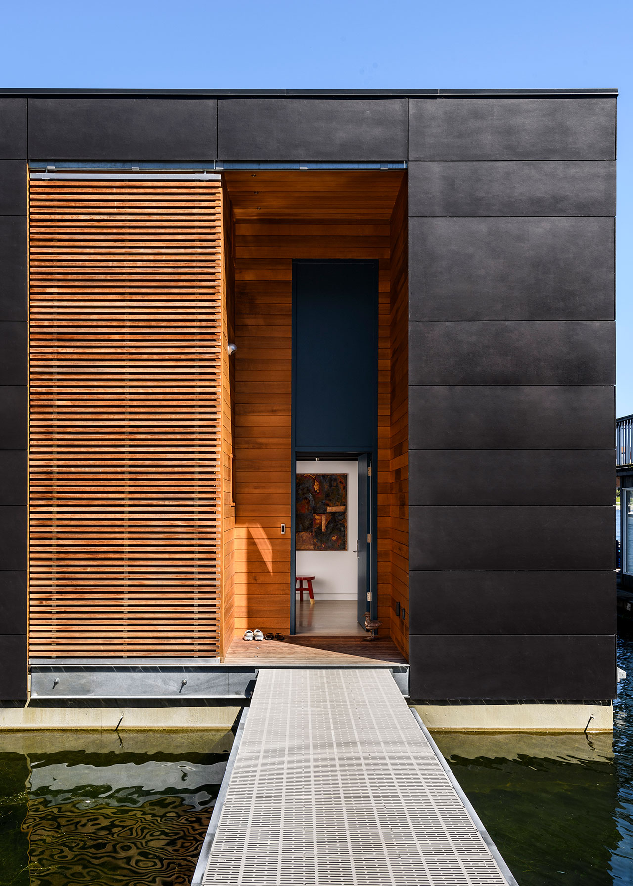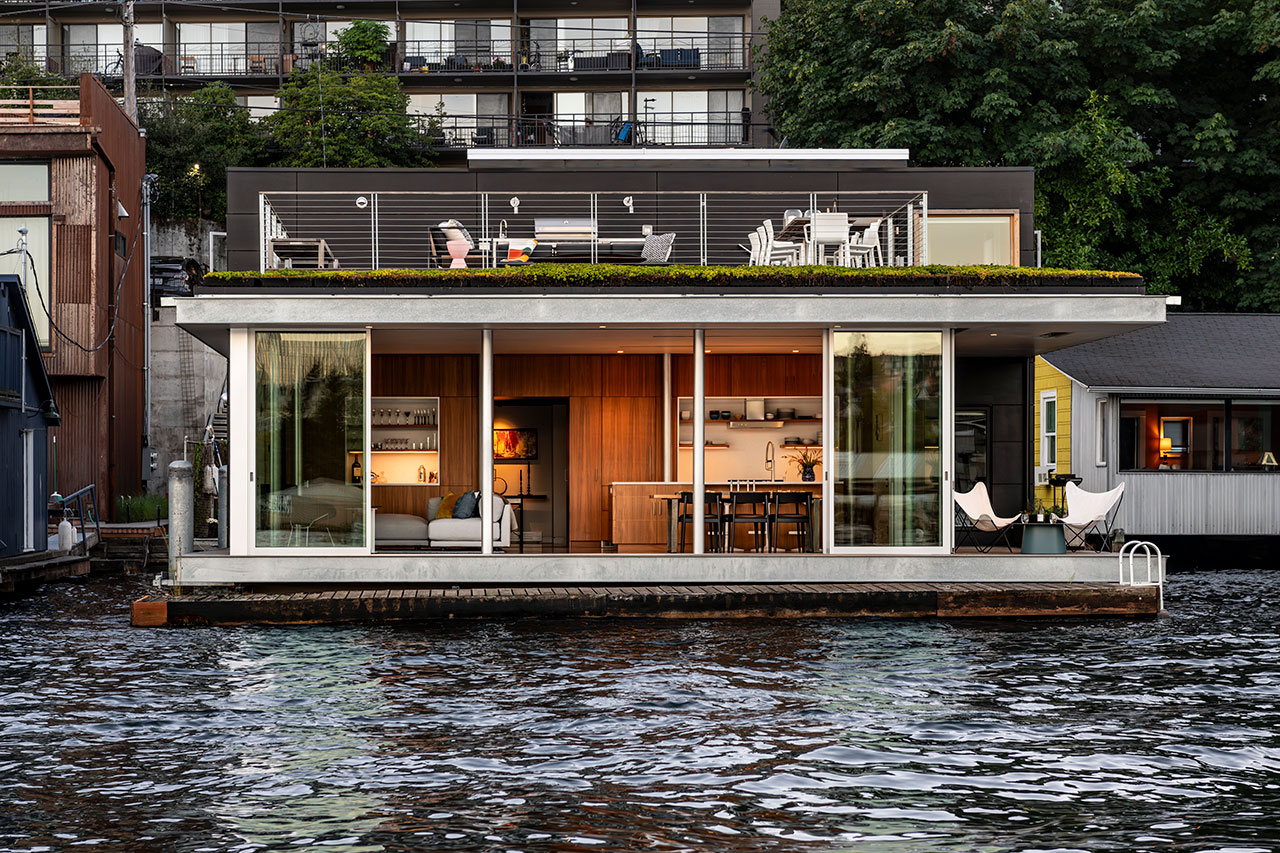 Replacing a decades-old houseboat that once occupied the canal slip, the project began with a new reinforced concrete float – a foundation that provides long-term stability and modern utility access for plumbing and electrical systems. The home itself was built in Dyna’s Ballard shipyard and carefully towed into place, a reminder of the precision required for floating architecture in Seattle’s waterways.