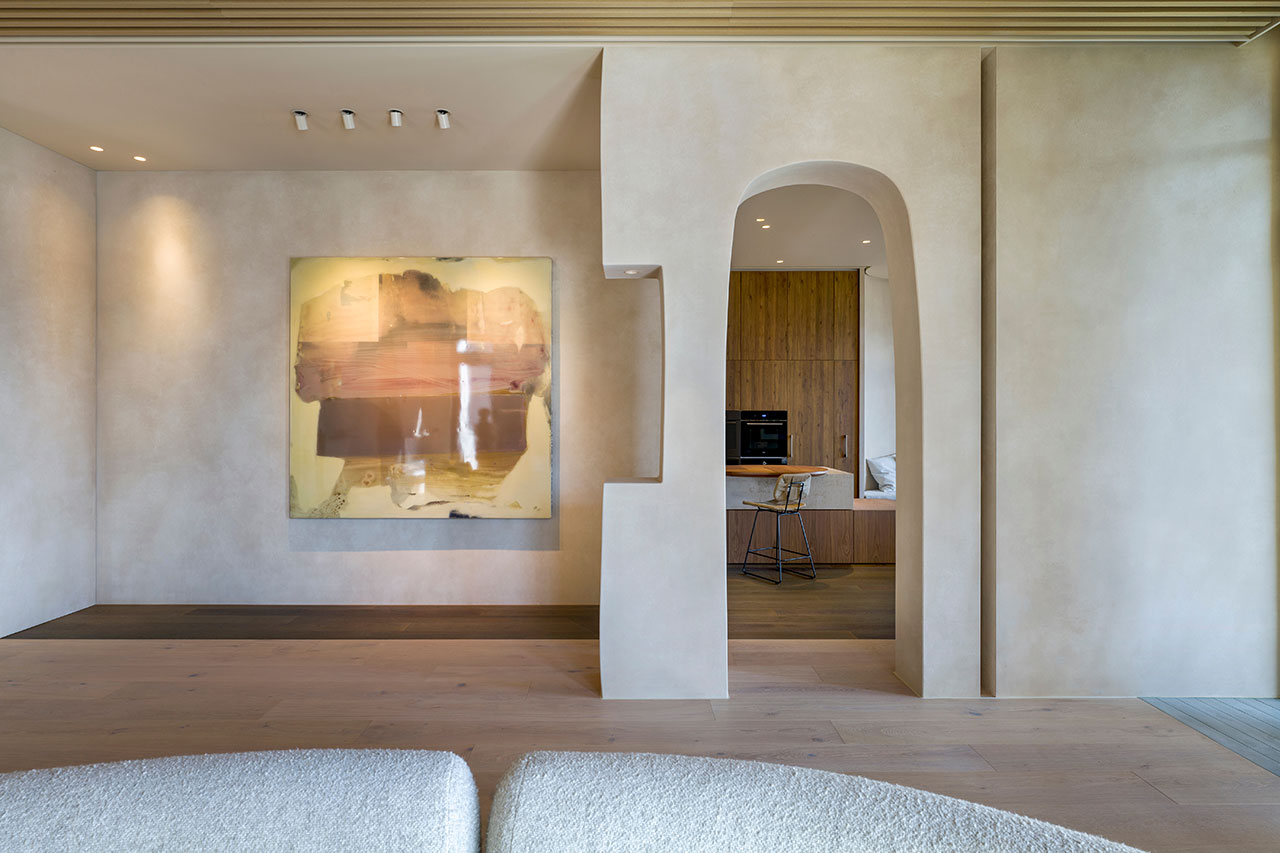 Lighting plays a crucial role in enhancing the villa’s spatial experience. Daylight is gently filtered through the home’s sculptural architecture, shifting with the sun throughout the day. At night, indirect lighting lines architectural transitions and recessed curves, emphasizing the fluidity of the spaces and allowing textures to glow softly.