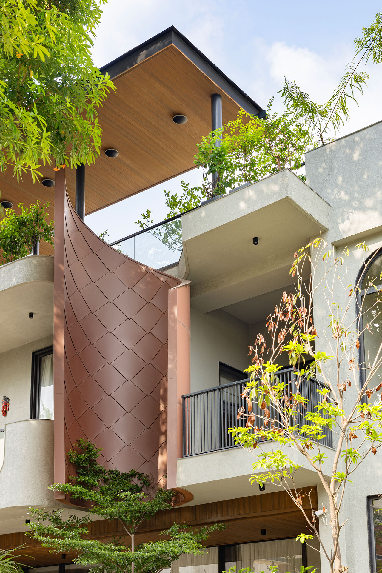 From the moment one steps inside, it’s evident that natural elements are the guiding force. An age-old tree marks the entrance – not simply preserved but celebrated, embraced by a curved zinc wall that both protects and frames it. This weathering metal facade will mature over time, developing a patina that reflects the ever-evolving story of the home and the family there. ”We chose zinc for its robust nature, timeless aesthetic, and unique weathering process – it galvanizes beautifully, much like the memories this home will hold,” Arora shares.