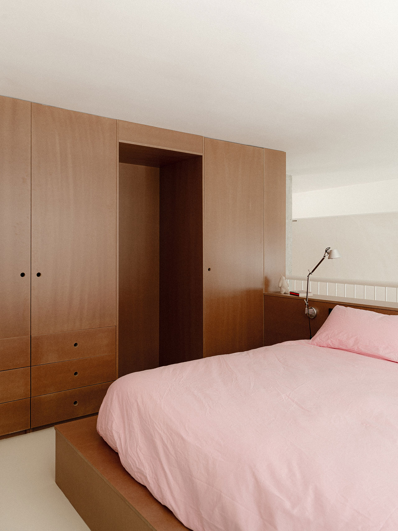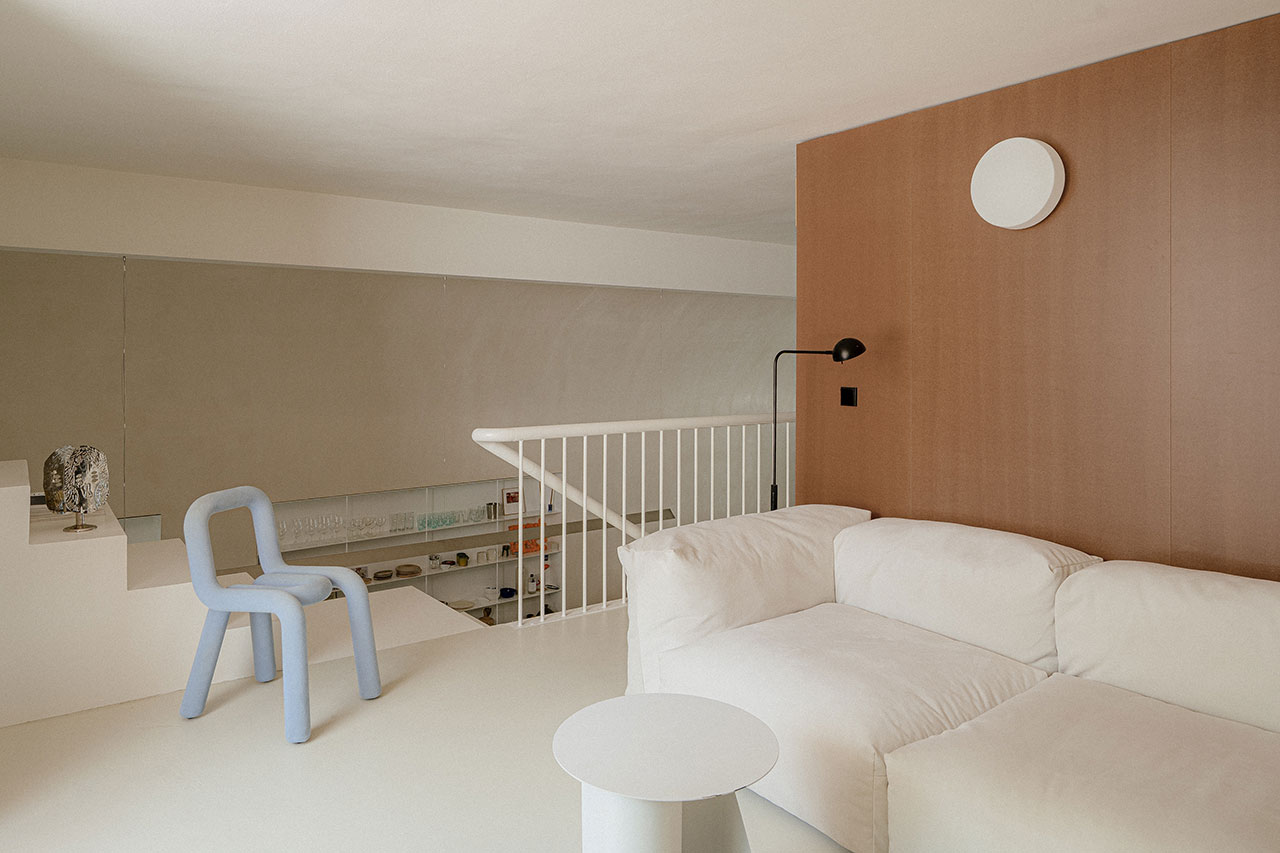A restrained color palette enhances the project’s sense of calm. Smooth white surfaces bounce light, making the modest footprint feel more expansive. Against this backdrop, a central wooden structure introduces warmth and texture upstairs – an integrated system of wardrobes and bookshelves, along with a private full bathroom, separates the bedroom area from the living room.