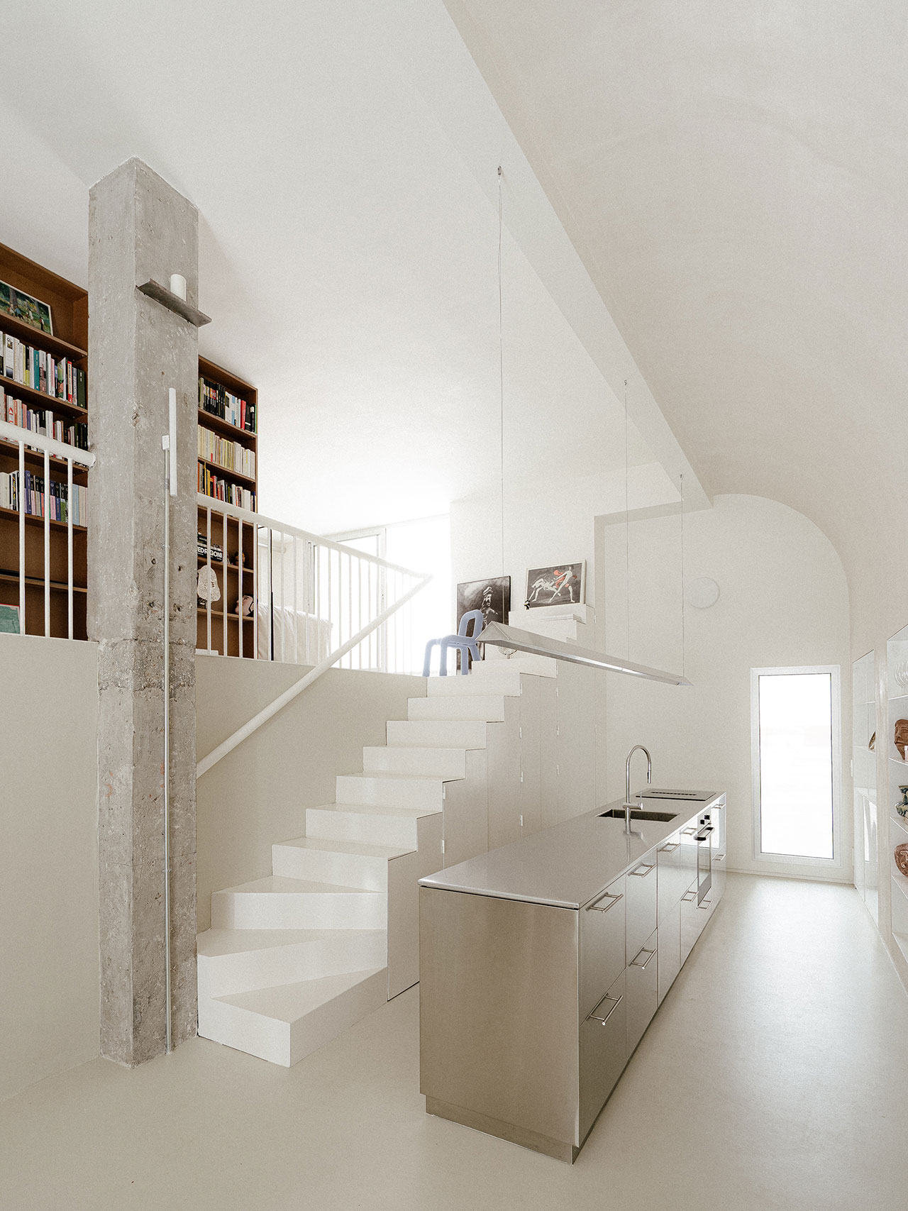 To manage uneven ceiling heights and conceal shared building services, the architects introduced a half-barrel vault above the public-facing spaces. This soft, curving form lends a sense of visual unity to the compact dwelling.