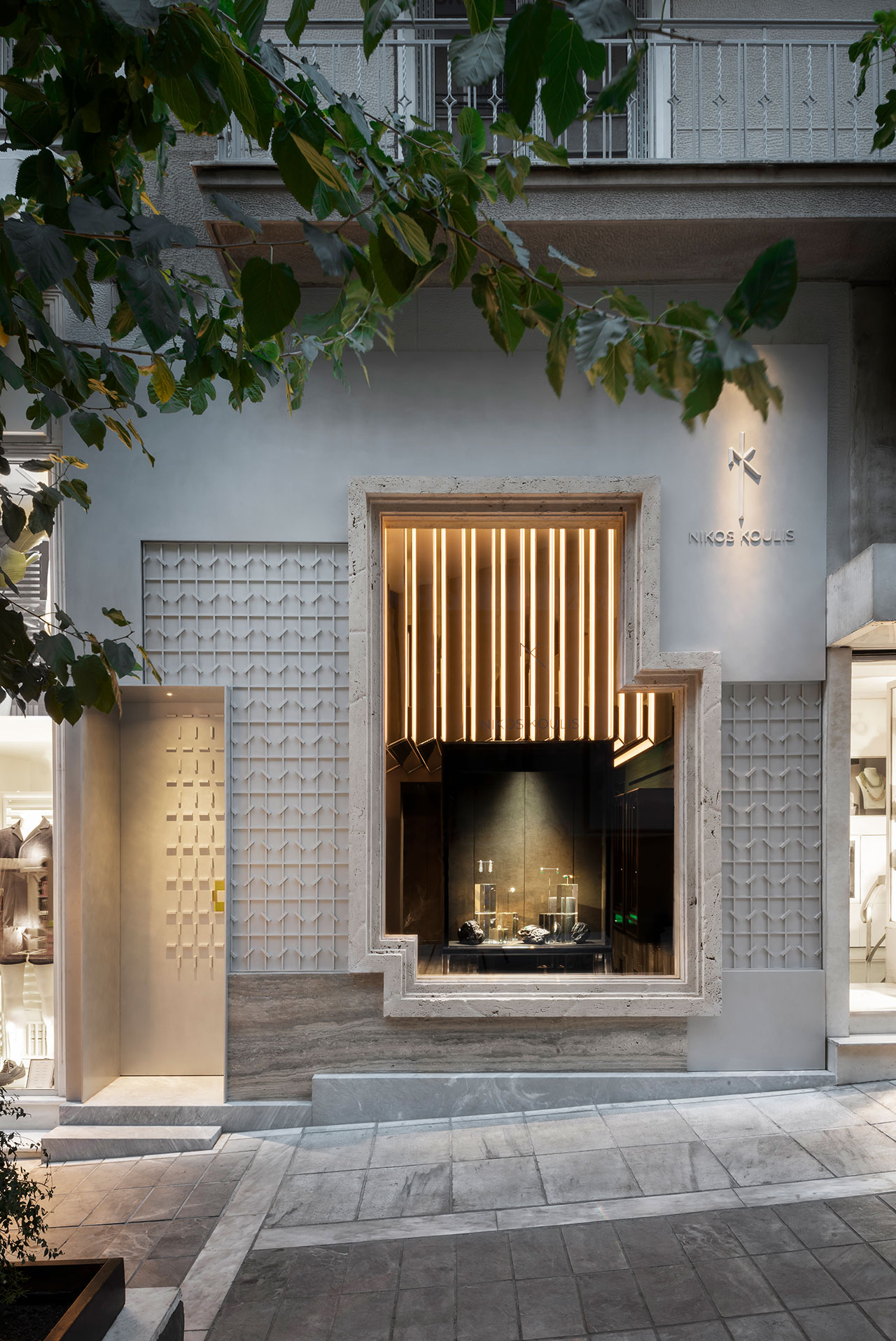 When Katerina Dionysopoulou and Billy Mavropoulos of Bureau de Change envisioned an Athens flagship for Nikos Koulis, they looked to his signature geometric pieces for inspiration. “The detailing and the impeccable mix of materials of Nikos’ jewelry became the drive for this whole narrative,” says Mavropoulos, the firm’s founder and director.