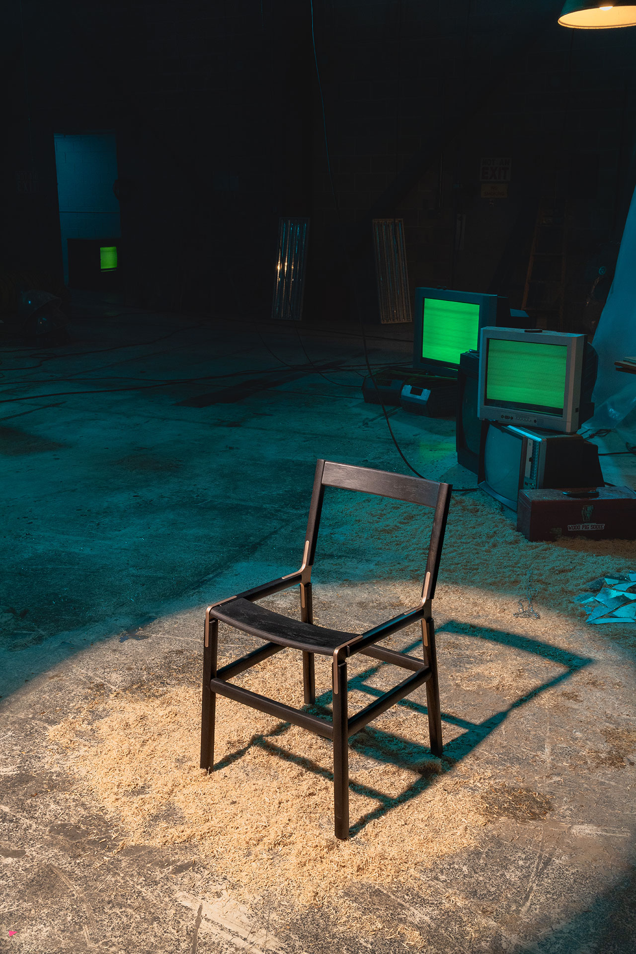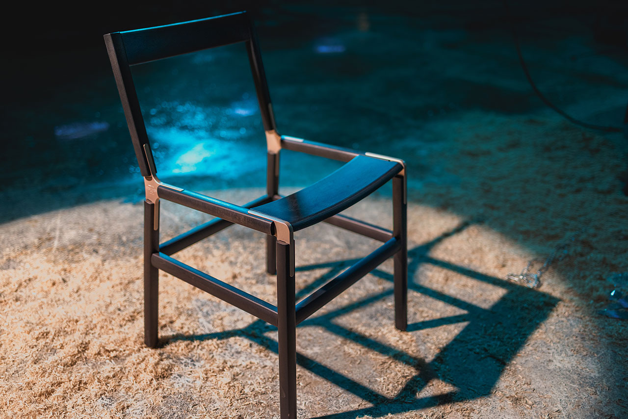 The chair’s slight silhouette, rendered in solid wood and finished in charcoal black, is accented with Fyrn’s patented Copper Bronze brackets, a nod to the precision and engineering that ground all of its designs. And yet, with its seat all but gone, what remains feels less like a place to rest and more like a sculptural embodiment of anticipation.