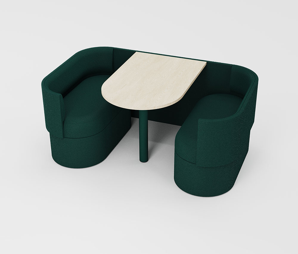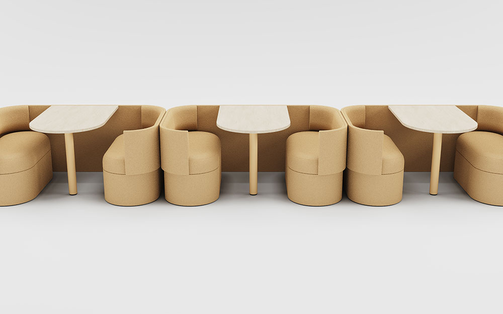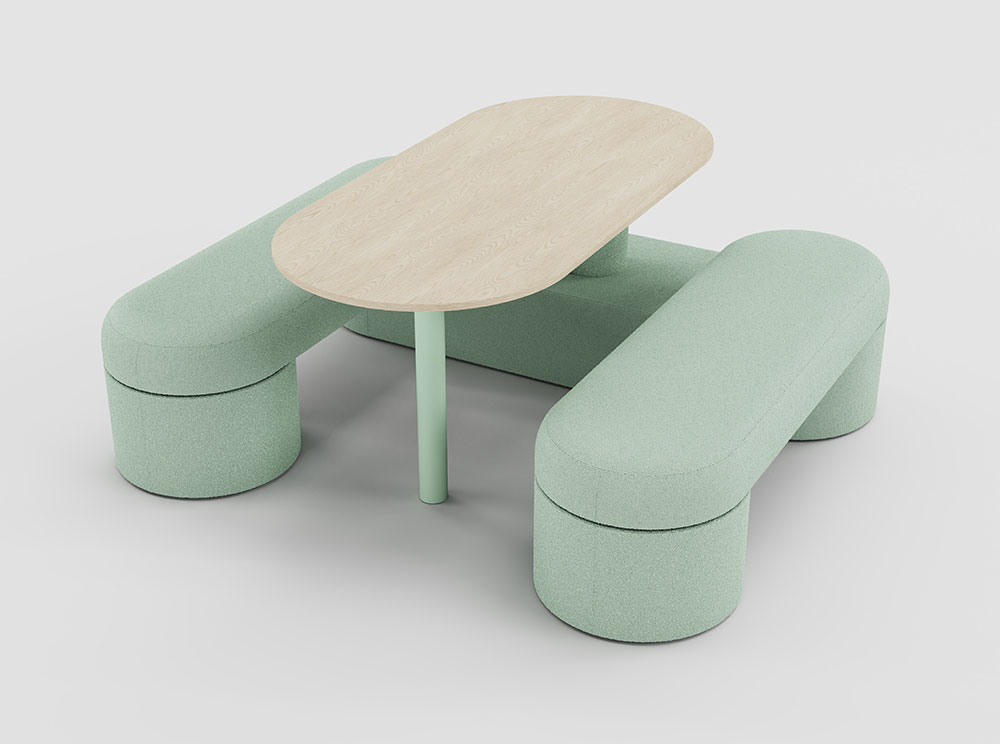 Made of a plastic frame and foam, the components are not only lightweight, they can also be fully recycled and disassembled. Specifiers may select modules with a high back, low back, or a more casual no-back style. These backs are lower than typical dividers, stopping slightly forward of shoulder height. Individuals are able to view their surroundings without obstruction, which creates a feeling of emotional security. Tate is reminiscent of a picnic table, with benches and a surface in the center. In this updated version, as elements are extended more space is available, accessible to wheelchair users and others with physical limitations.