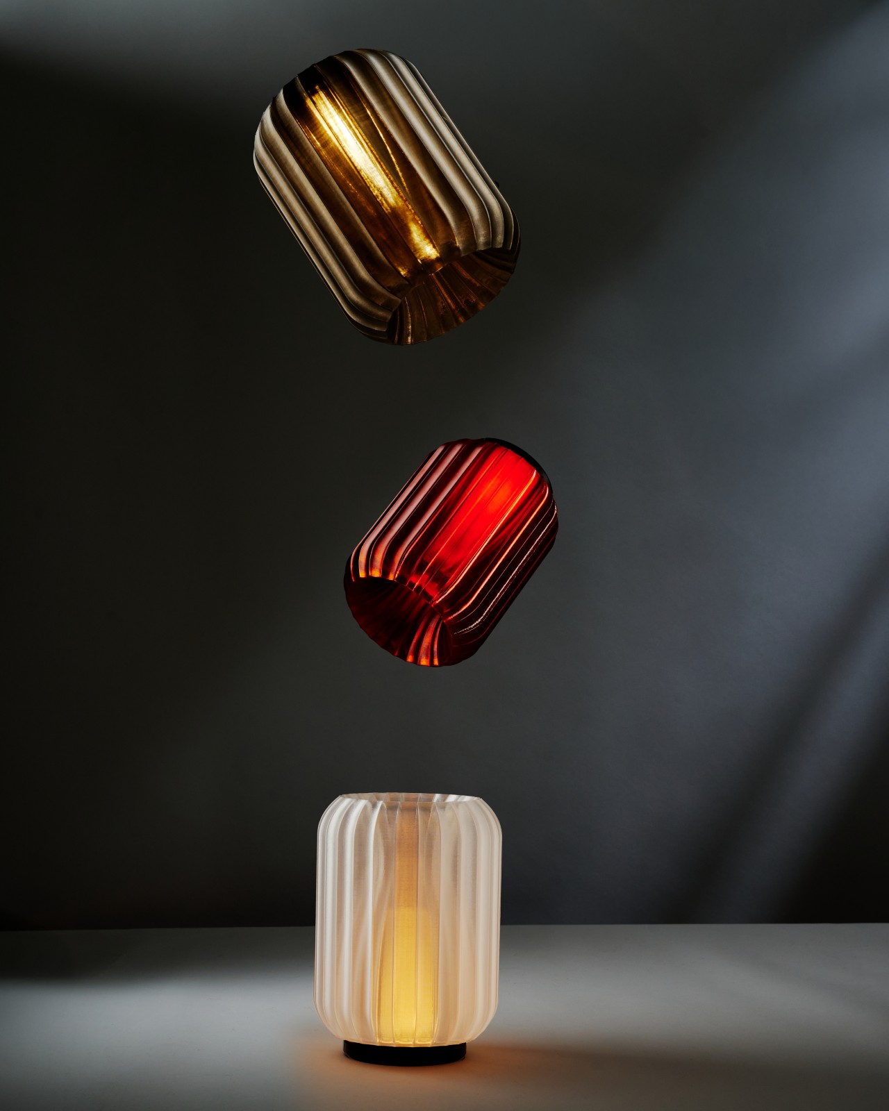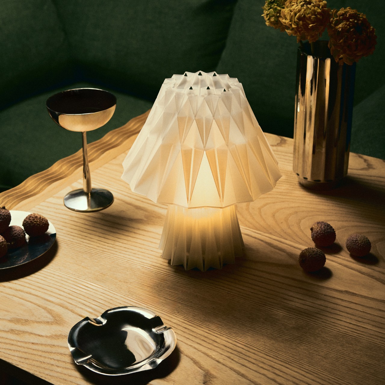 Available in amber, smoke, and clear, the Mini Allium Lamp casts a warm glow that makes any corner feel instantly cozier. For some added drama, the Prisma Lamp strikes a pose as a sculptural tower of origami-inspired folded pleats, guaranteed to spark conversation.