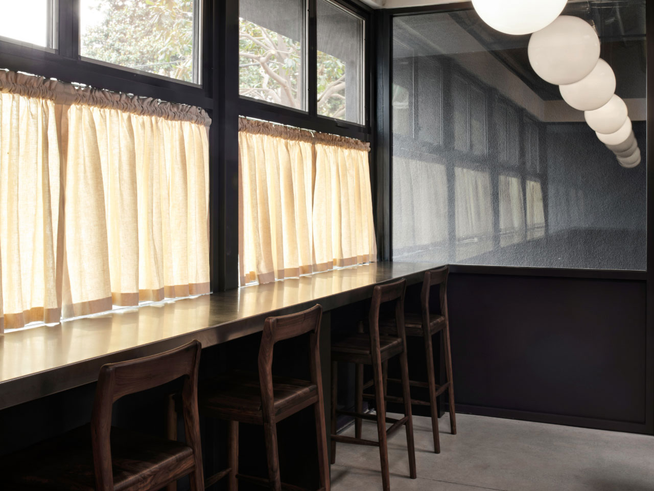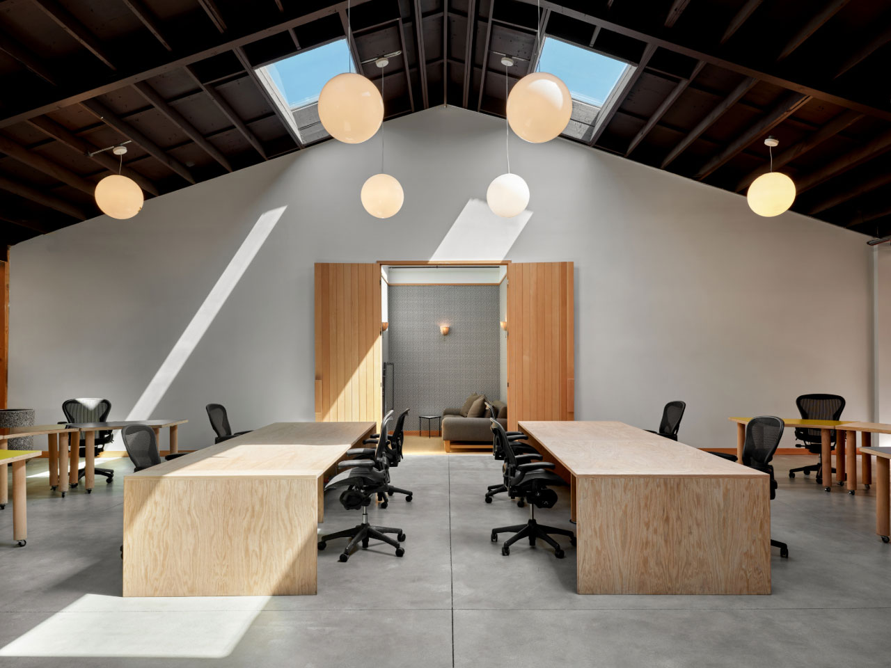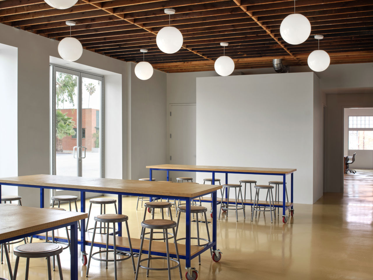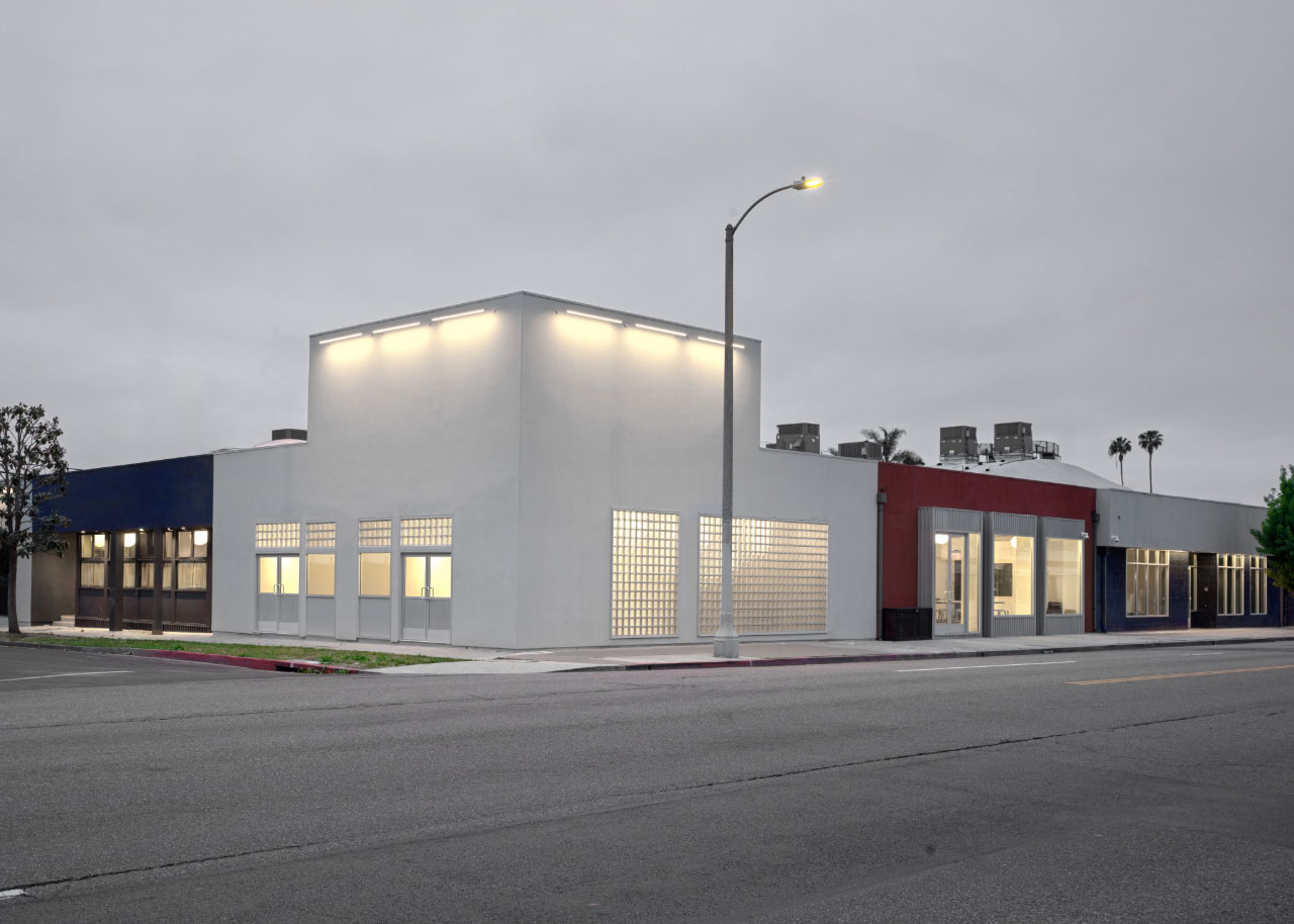 Located in West Adams, one of the oldest neighborhoods in the city, the site spans an entire block, and features four existing structures formerly part of a cabinetry fabrication facility. Shadow Architects also completed Mother’s office in Gowanus, Brooklyn, and the firm wanted to put a decidedly California twist on a sense of community – and looked right outside the door for inspiration. “We really focused on the idea of the storefront and how it interacts with street life,” notes Rachel Newton, senior designer and project manager at Shadow Architects. Exterior elements like wide overhangs, aluminum siding, and textured stucco call to mind the area’s industrial roots.