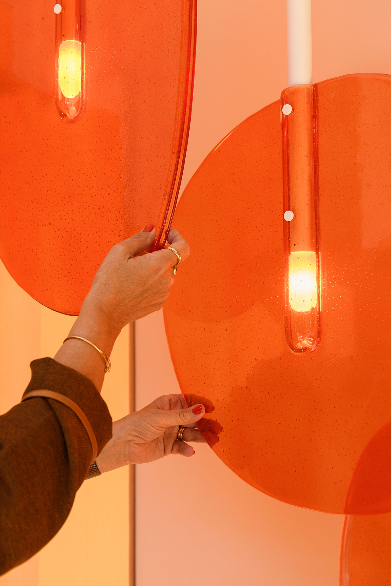 Lighting – often the most functional of design categories – was transformed into something malleable, even kinetic. Visitors encounter Ariel Zuckerman’s knitted pendants, which resemble globes suspended in nets, and luminous glass fixtures that evoke lollipops or floating suns. Together, these choices create an environment that feels at once joyful and surreal. Ordinary objects become extraordinary through context and imagination.