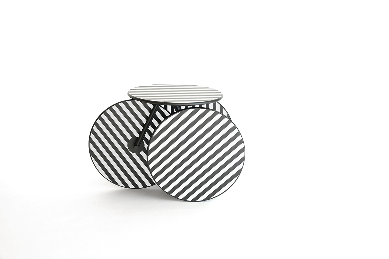 In its simplest styling, Rolly is presented in a toned black or natural birch, which both showcase the wood grain’s distinctive variance. A bold black-and-white striped version with a sleek satin finish is an unexpected yet delightful addition to the fleet, demanding all kinds of attention. As each circle is identical yet positioned at differing revolutions in their cycle, the stripes intersect to form unique patterns and parallels all their own.