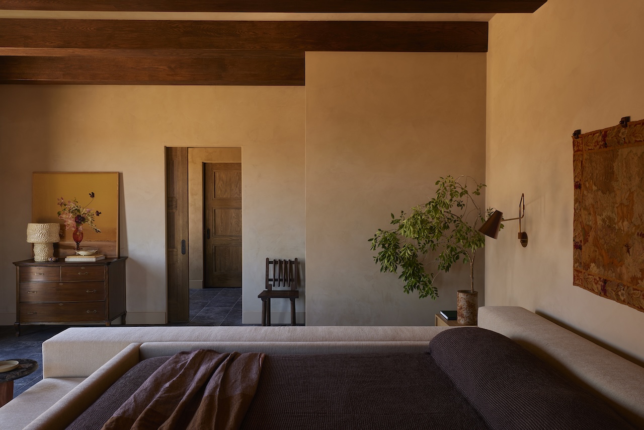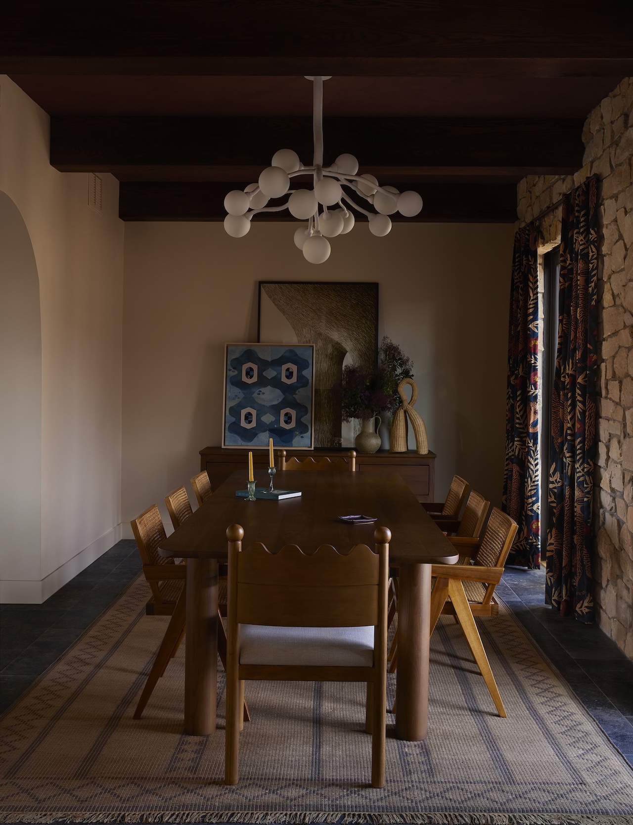 Perhaps most telling is how Holmberg describes the sensory experience of the site itself: “The landscape has a total hush to it. It is a plot of land that feels so ancient and deserving of respect, that you cannot be in the house, or on the land, without sensing that deep, ancient reverence.” This quality of hushed reverence permeates the design decisions, from the dining room chandelier from Bourgeois Boheme Atelier that evokes a fossil formation to the vintage pieces carefully sourced from 1stDibs and Chairish that bring historical depth to the contemporary space.