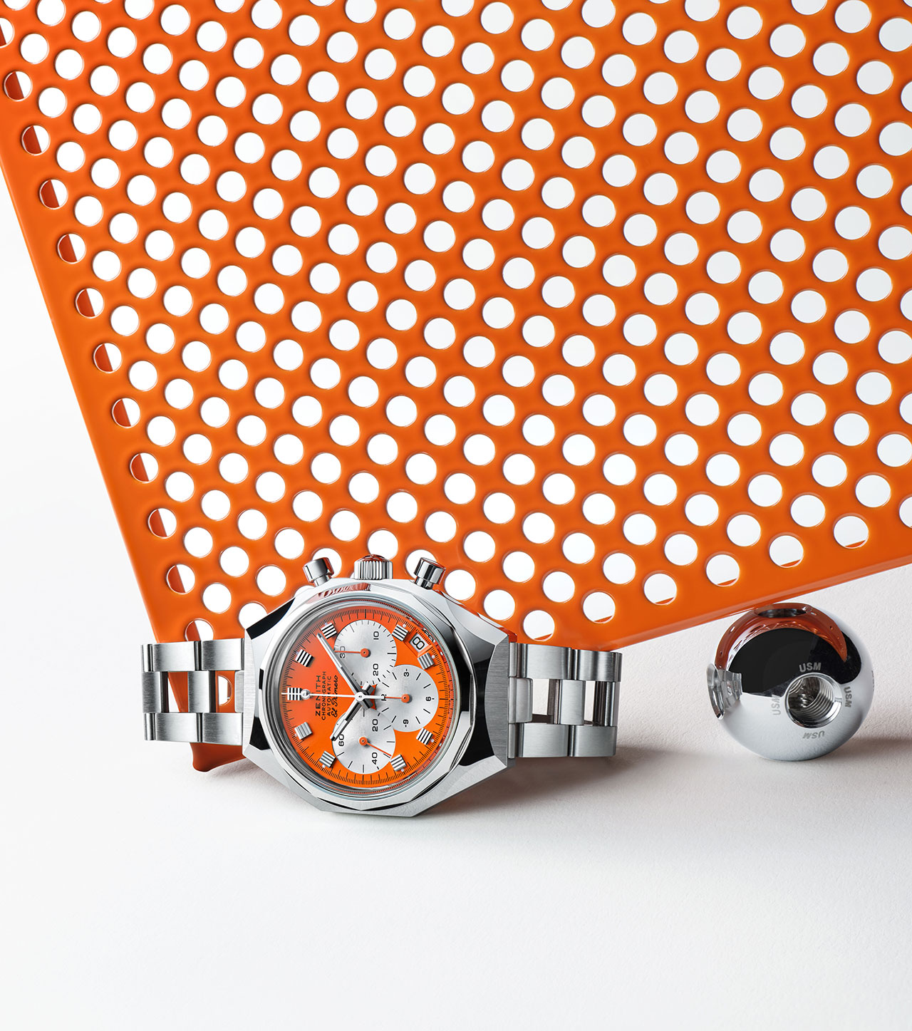 Celebrating the imagined convergence of these two iconic designs is the new DEFY Chronograph USM capsule watch collection. Available in emblematic Green, Golden Yellow, Gentian Blue, and Pure Orange – tones one might find adorning the panels that insert-into a USM shelf – the limited edition time pieces are encased in a 37.3mm stainless steel body with a bold 14-sided bezel and a signature Zenith “ladder” bracelet.