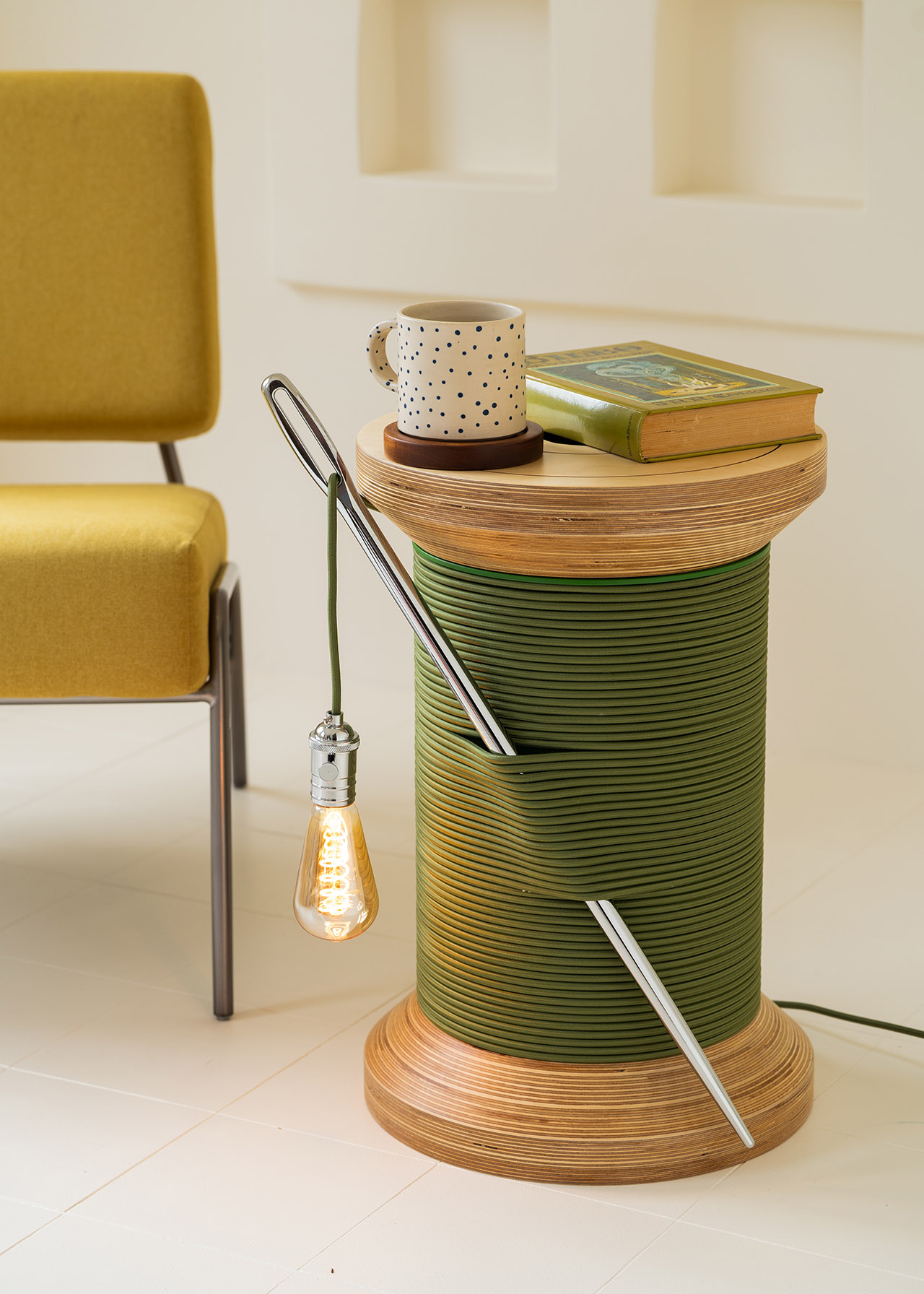 Saving the best for last – the Spool Table. From the mind of Simone Giertz, founder of Yetch and countless other inventions, this table boasts a satisfyingly enormous needle, slotted neatly through the folds of “thread,” played well by electrical wire. An Edison bulb sits right through the eye, offering a warm lighting solution while also sneakily offering storage in the body, keeping spaces tidy. If you’ve ever wanted to feel like you were the mouse in your house, this table offers a distinct “three inches tall” kind of feeling, keeping wonder alive.