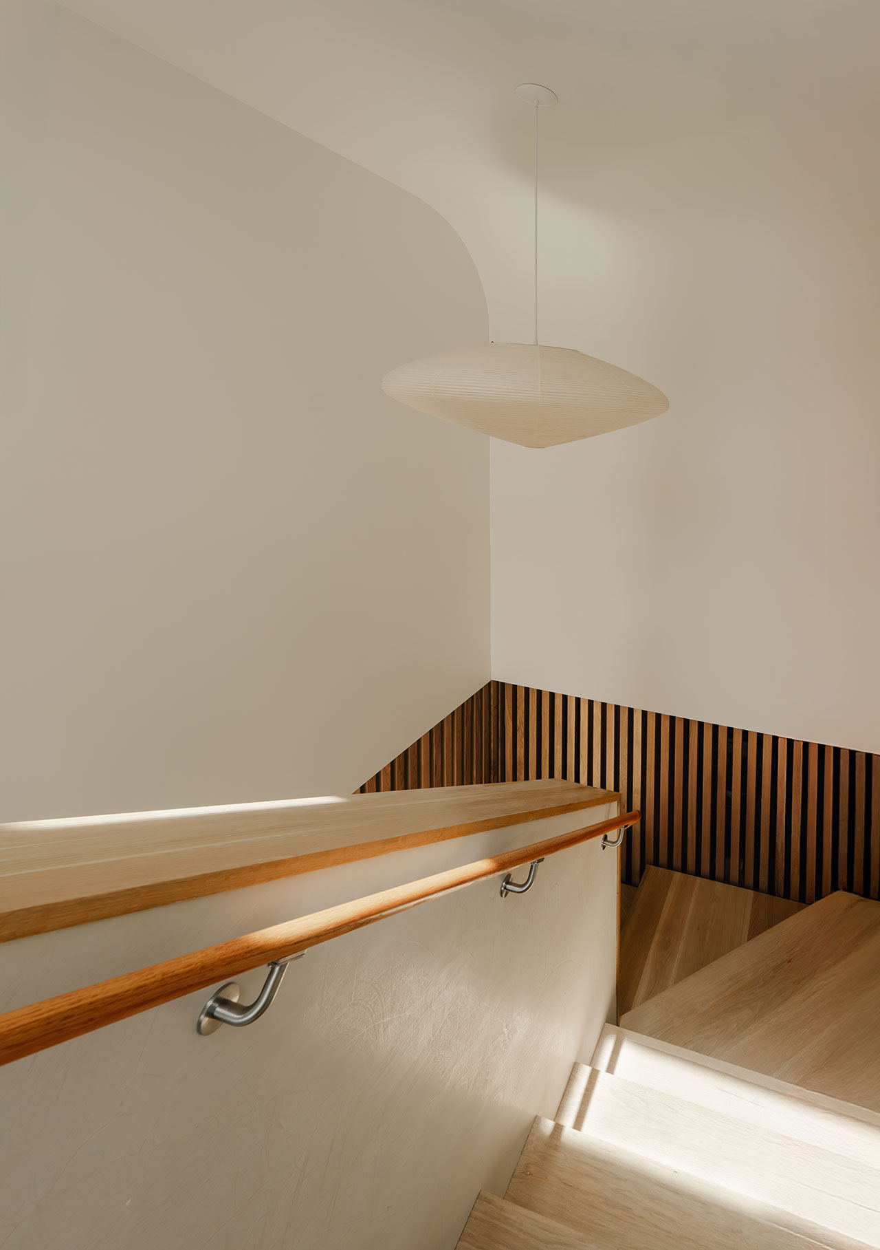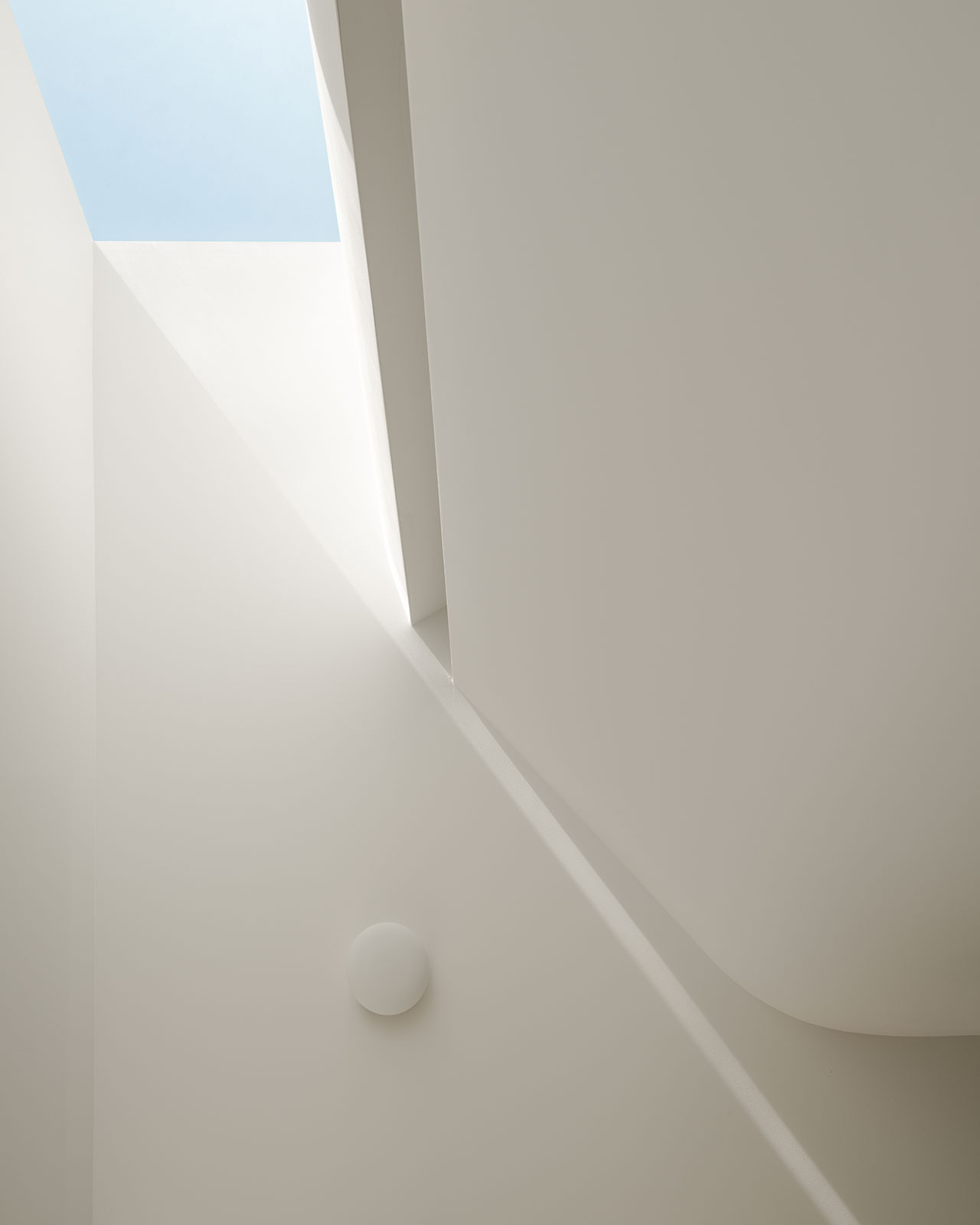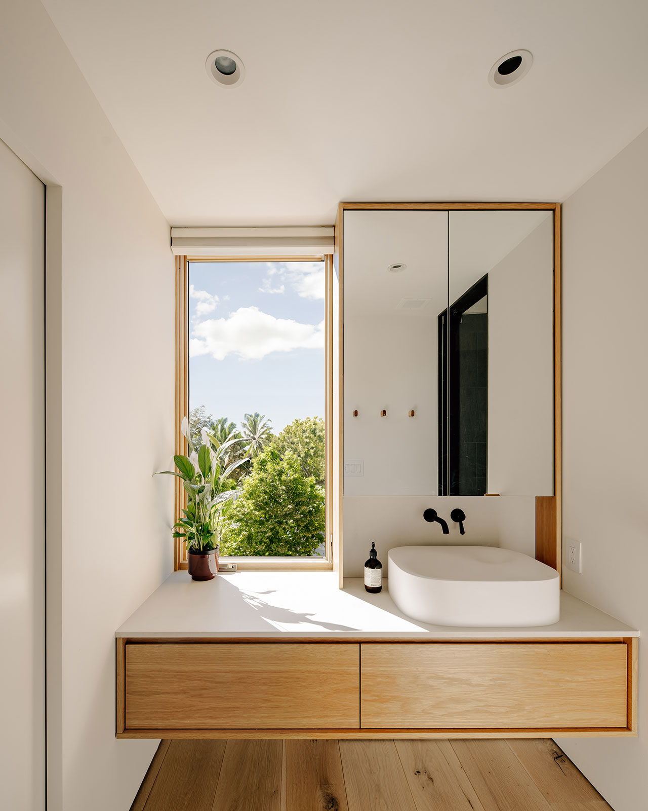 At the center of the layout, a skylit stairwell serves as a sculptural element that leads to the second floor. Designed for passive ventilation, it channels light and air through the home while discreetly housing mechanical systems. Upstairs, the compact footprint is organized with efficiency: the primary suite features a slate-lined wet room and a cedar soaking tub, while the children’s rooms each include playful lofts for rest and imagination.