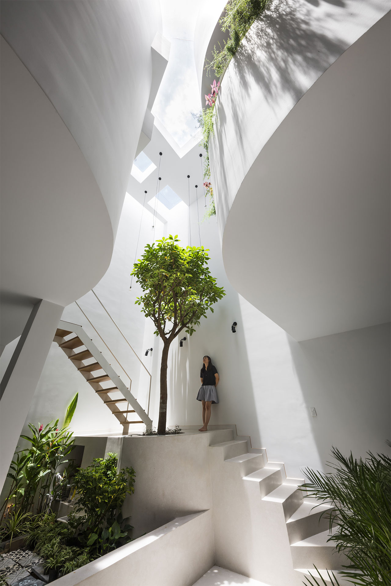Designed for a young woman and her visiting family in Ho Chi Minh City, Vietnam, the appropriately named House for a Daughter is an open and airy residence from Khuon Studio. The goal was to prioritize natural light and plants, which they did just that with multiple built-in gardens for varieties of plants, as well as a tree embedded into a stairwell landing in a white-walled void within the home.