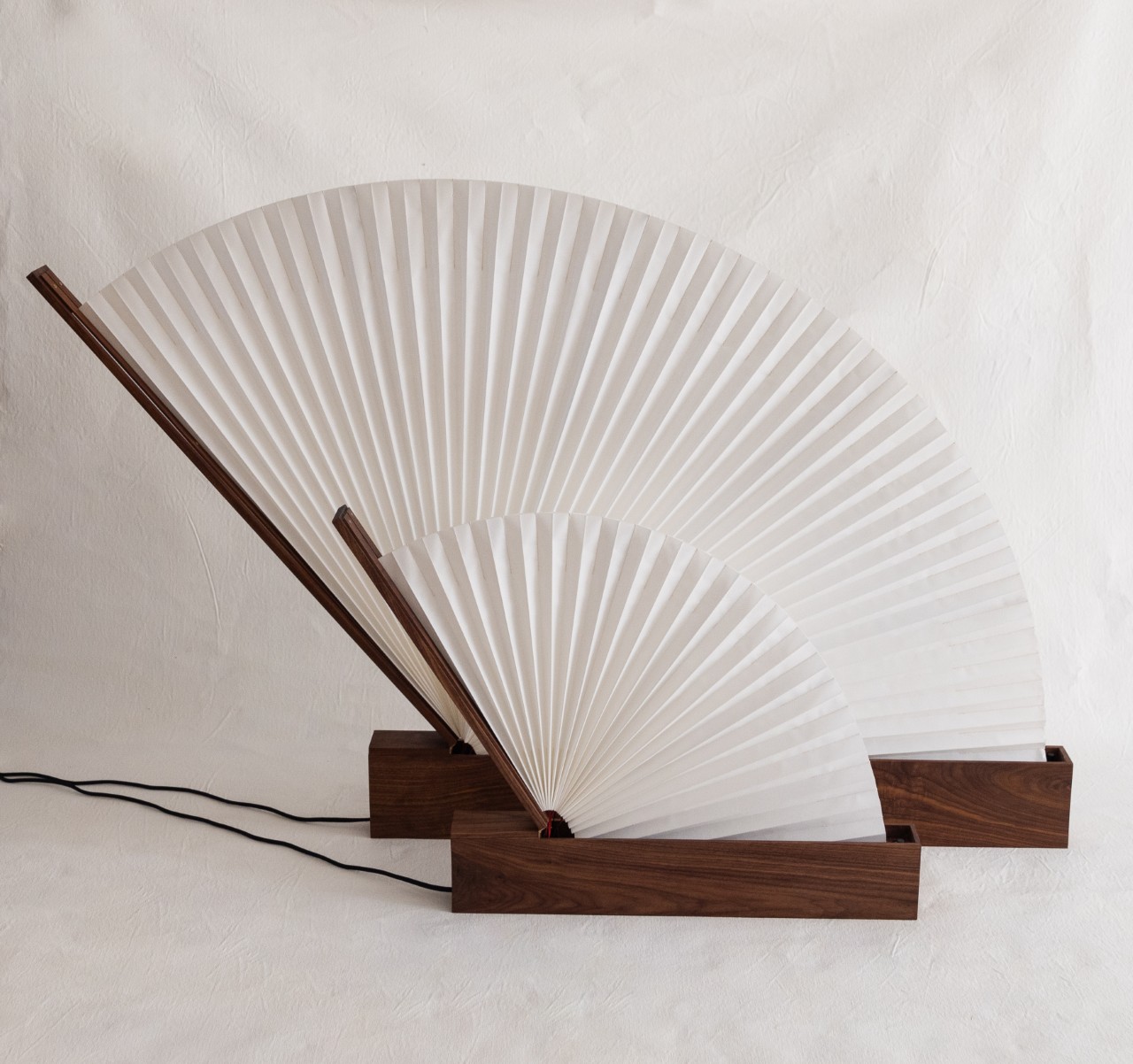Wolfe pleated and saddle-stitched two layers of paper – a technique borrowed from his background in handbag making – to form the light’s sail. The paper diffuses the glow with a gentle warmth while maintaining its shape with surprising strength. Within the folds, embedded LED strips bring the piece to life, while the walnut base discreetly conceals the mechanics – the dimmer, driver, and switch – to preserve the lamp’s minimalist form.