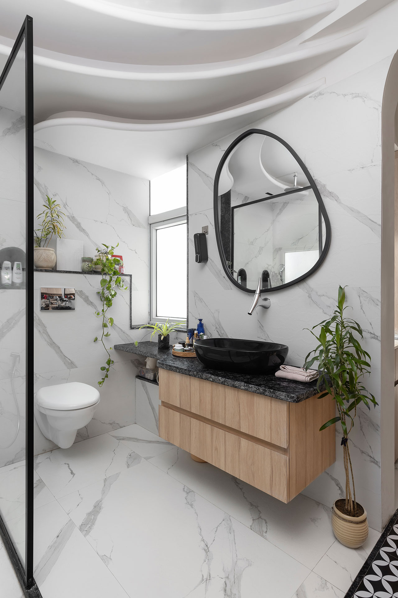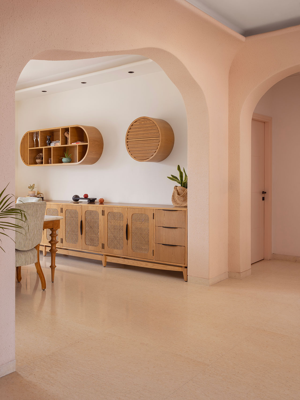 The color palette leans into gradients of beige, white, and blush tones, layered with tactile warmth. Honey oak flooring in the bedrooms contrasts with the smooth Bottochino marble of the main living areas, while subtle variations in texture – linen drapes, rattan accents, and curved archways – introduce softness. The design follows Vaastu principles, ensuring spatial balance and energy flow that supports the home’s tranquil aesthetic.