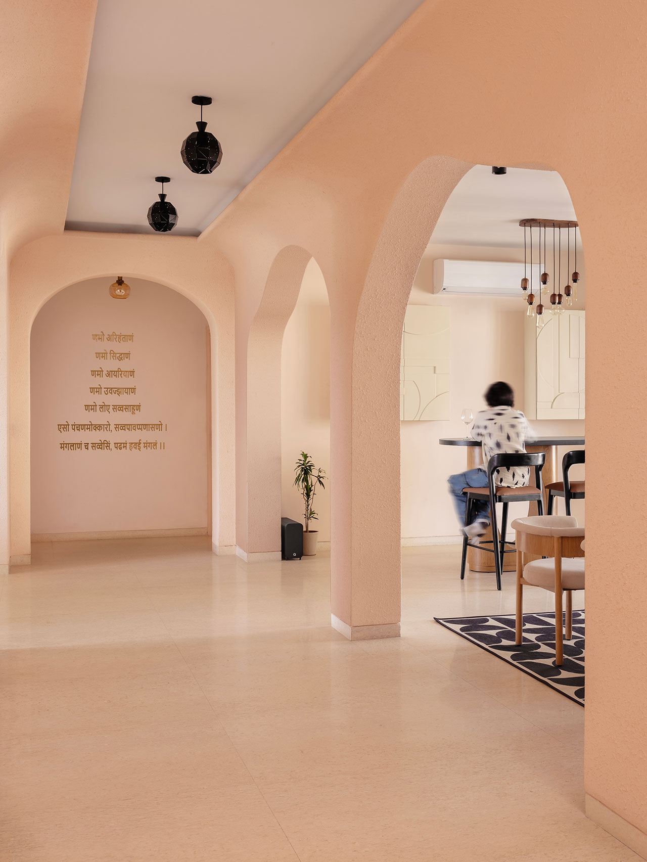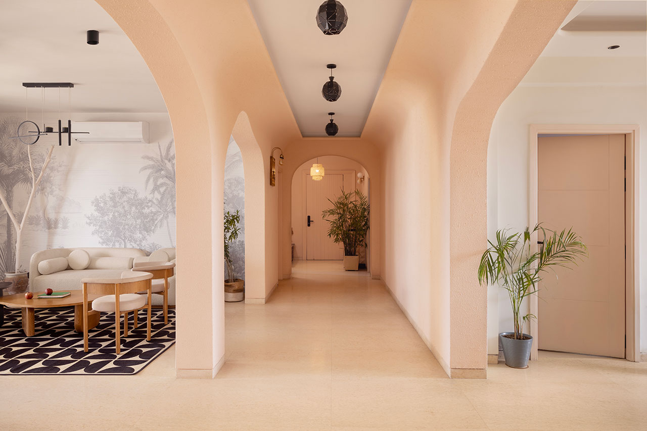 The entryway sets the tone with irregular arches that feel sculpted rather than constructed. Decorative artwork punctuates the soft-toned corridor, while a statement Boho pendant light hangs above.