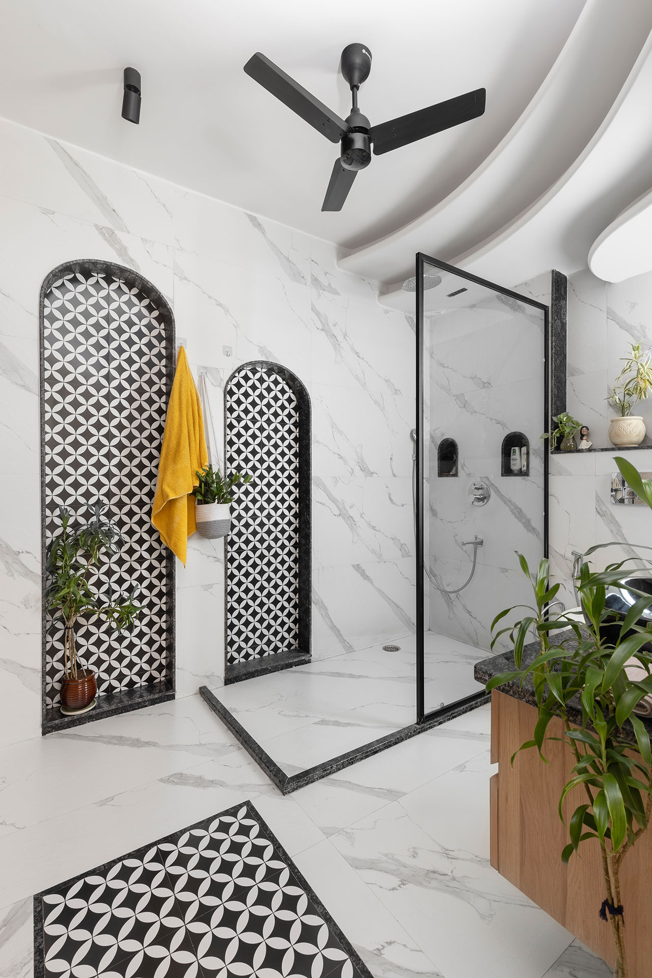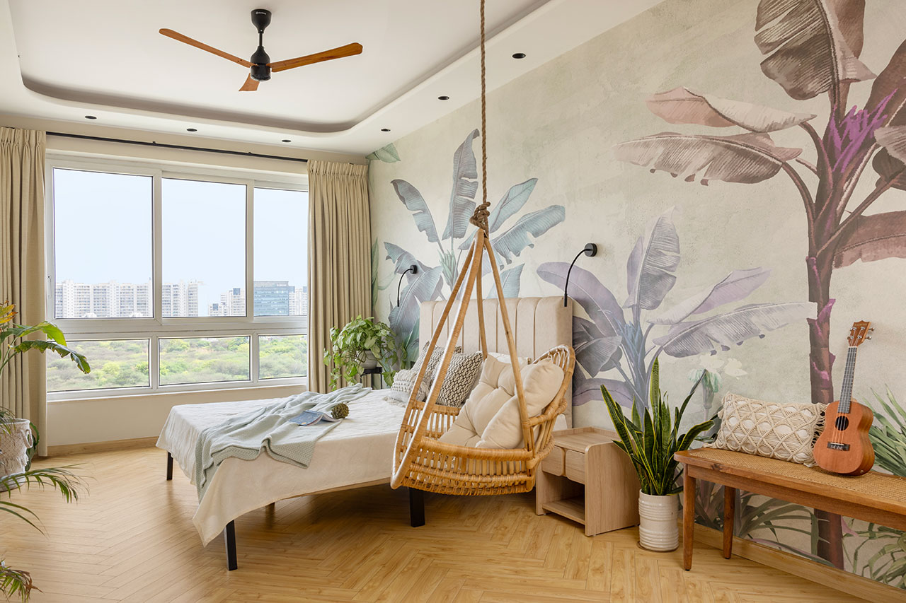 In the primary bedroom, a swing tucked beside the bed invites relaxation, while tropical wallpaper lends a playful, Boho counterpoint to the otherwise muted palette. The adjoining bathroom, finished in monochrome tiles and soft arches, continues with curves over corners, tone over contrast.