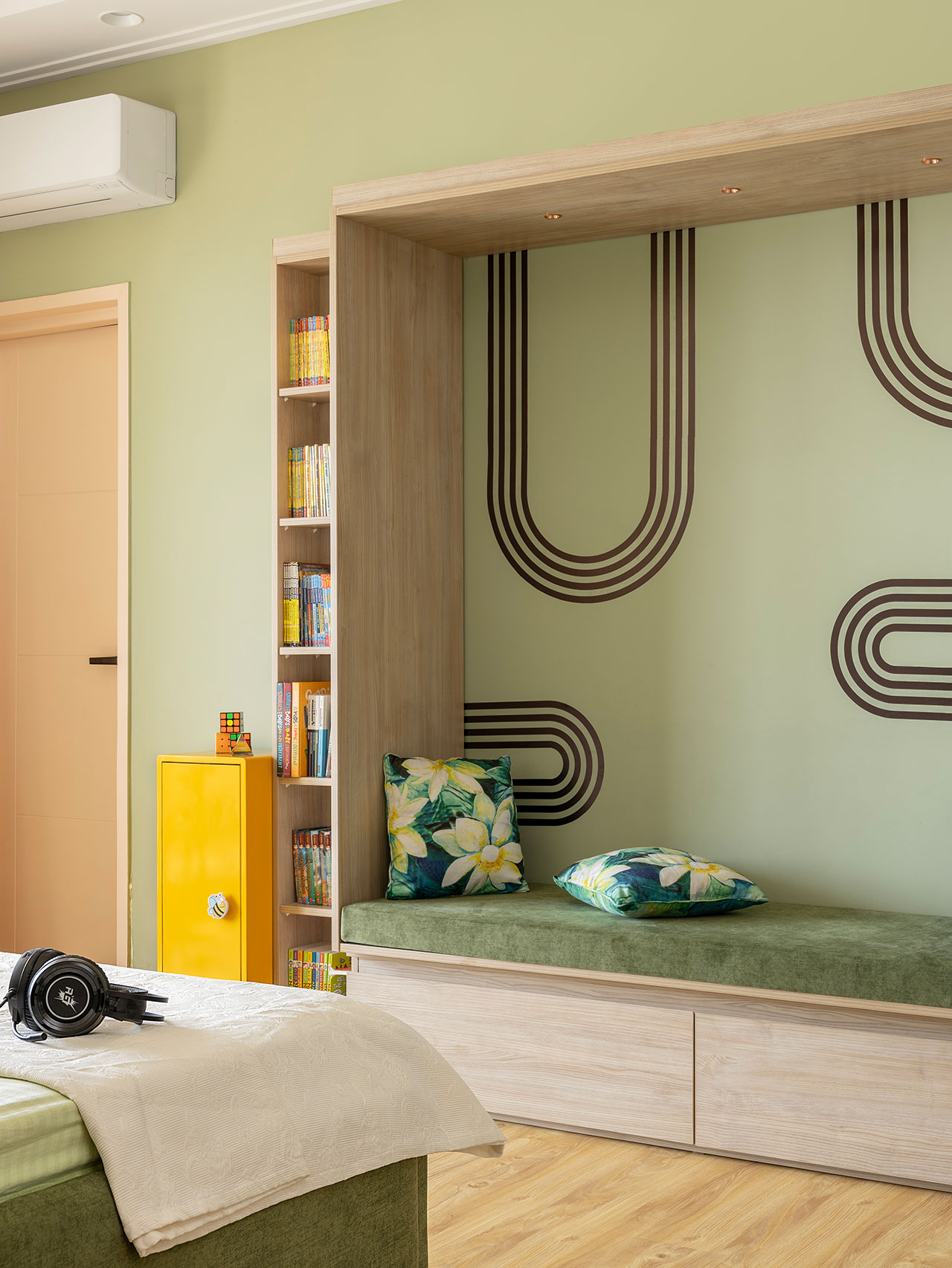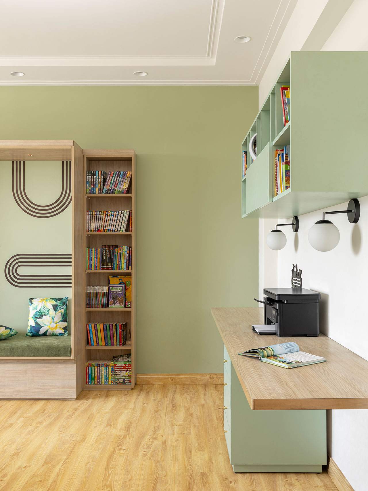 The children’s bedroom is all about creativity and playfulness. Soft olive green fabric on the upholstered bed is topped off with a fluted headboard, paired with a custom wallpaper that feels whimsical yet sophisticated – designed to evolve alongside the child as they age. Rounding out the space is suspended jungle gym bars hanging above that they can climb on during play time.