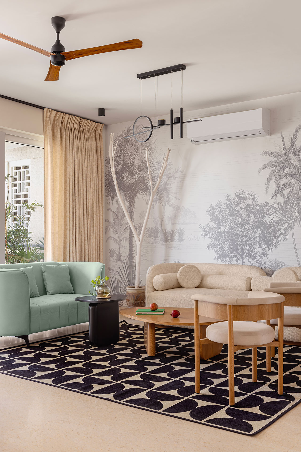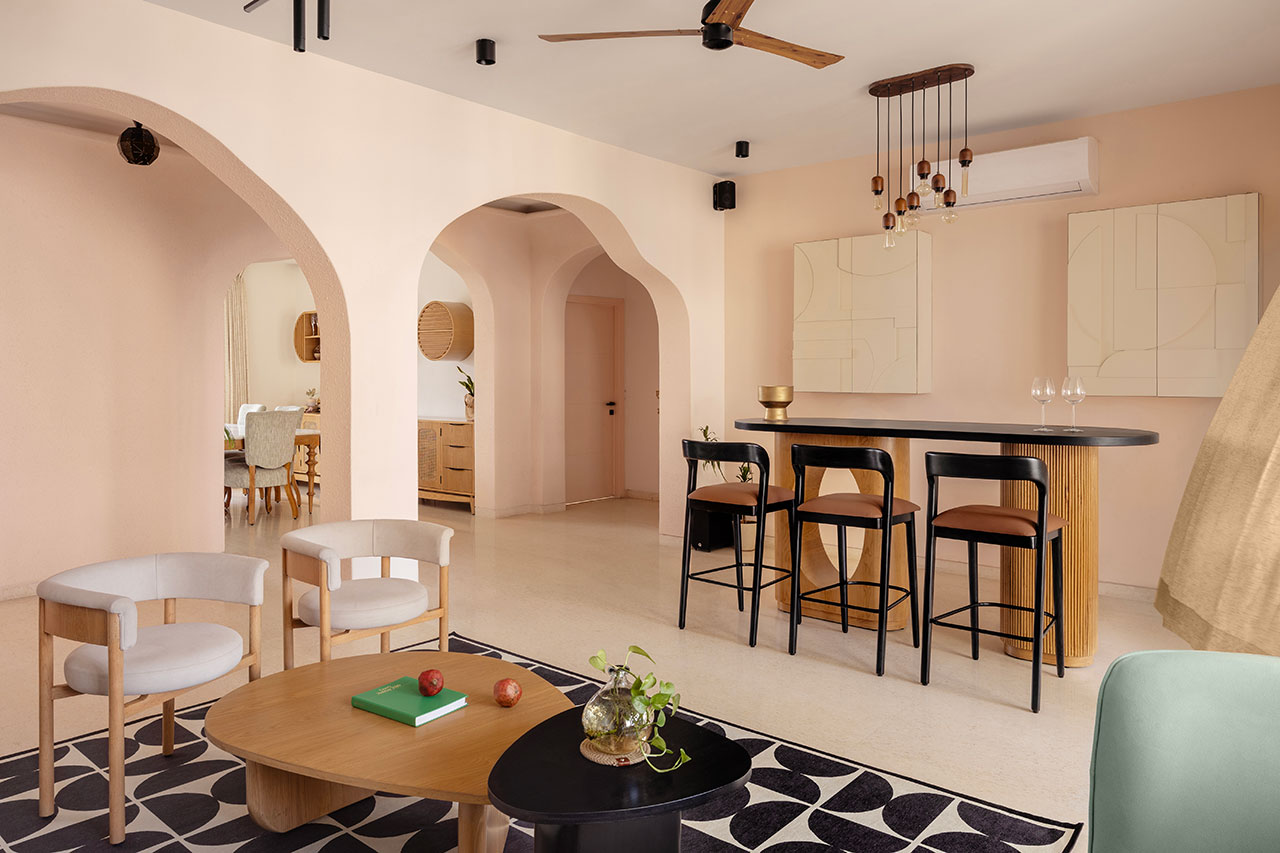 Desiring a hint of Goa’s coastal vibes in the city of Gurugram, India, the Spring Breeze Apartment by Aavahsa reimagines urban living through a vacation-inspired lens. Perched high on the 20th floor of Palm Springs Society building, the 3,600-square-foot home captures the essence of a serene getaway without ever leaving the city – its design born from a blend of Japandi and Boho styles.