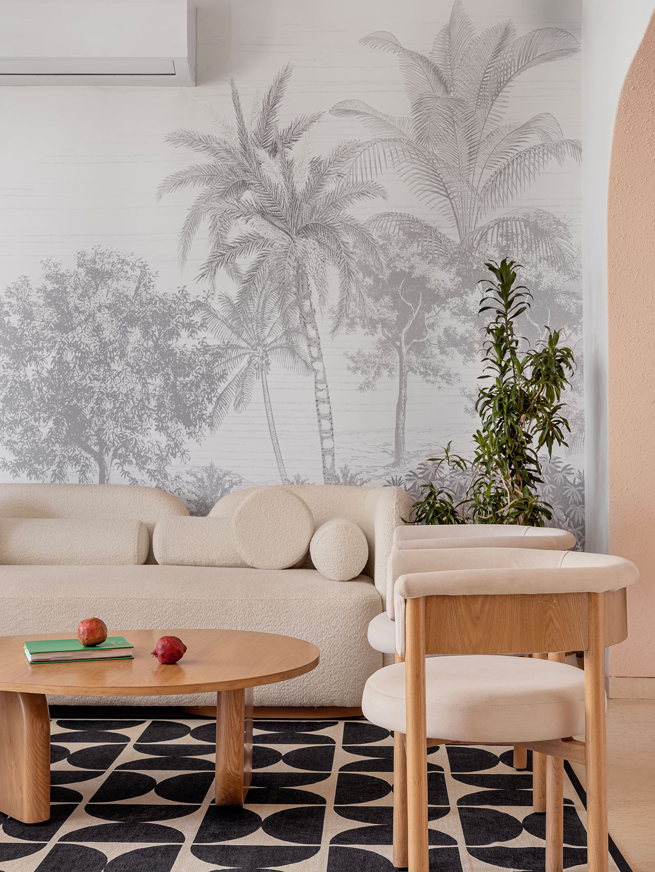 In the living and dining areas, tropical wallpaper and a plush off-white bouclé sofa bring coastal charm. A pair of organically shaped coffee tables rest on a black and beige rug, that helps to ground the space. Across the room, the dining nook’s white marble tabletop and oak-cane console cabinet offer a mix of refinement and rusticity. Every surface is chosen to amplify light – translucent curtains, soft wall textures, and reflective marble tones create an interior that feels effortlessly elegant throughout the day.