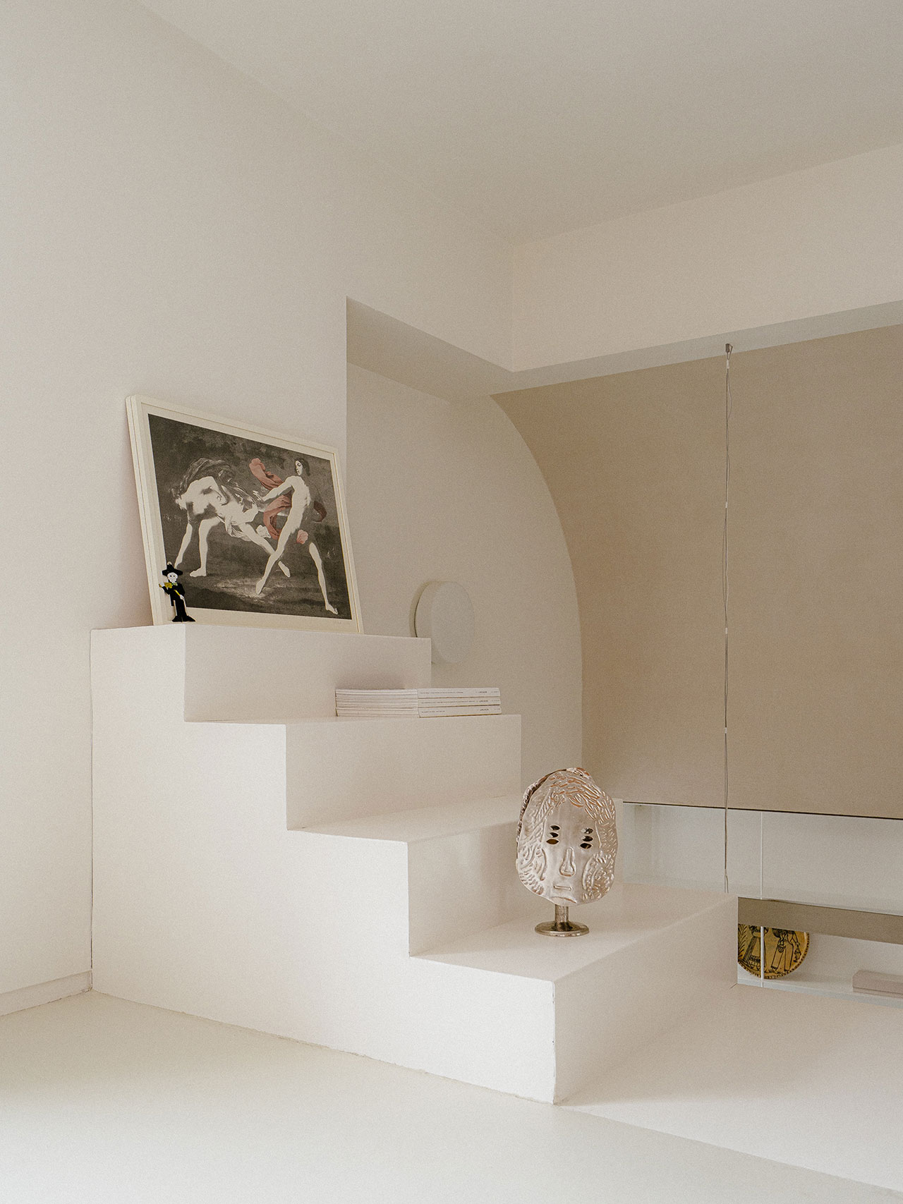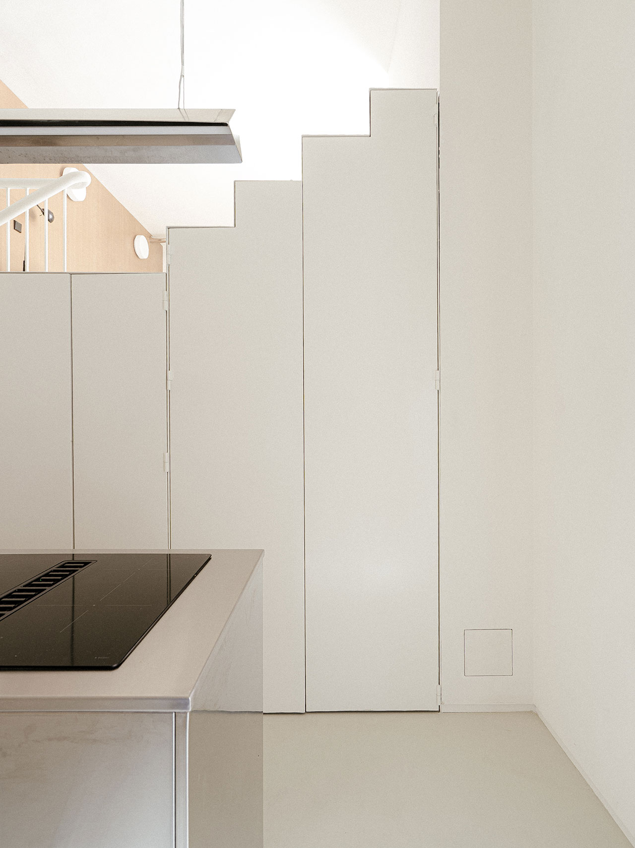 At the intersection of these two areas stands the project’s defining feature – a clean white staircase that serves as both sculptural focal point and practical storage hub. Beneath its geometric form, BURR Studio hid a compact bathroom and a series of stepped compartments that follow the slope of the stairs. These concealed storage units house essentials like kitchen appliances, pantry items, and cleaning supplies, maintaining a seamless, uncluttered appearance. The compact bathroom tucked below feels almost like something aboard a train or airplane – efficient and just the right size.