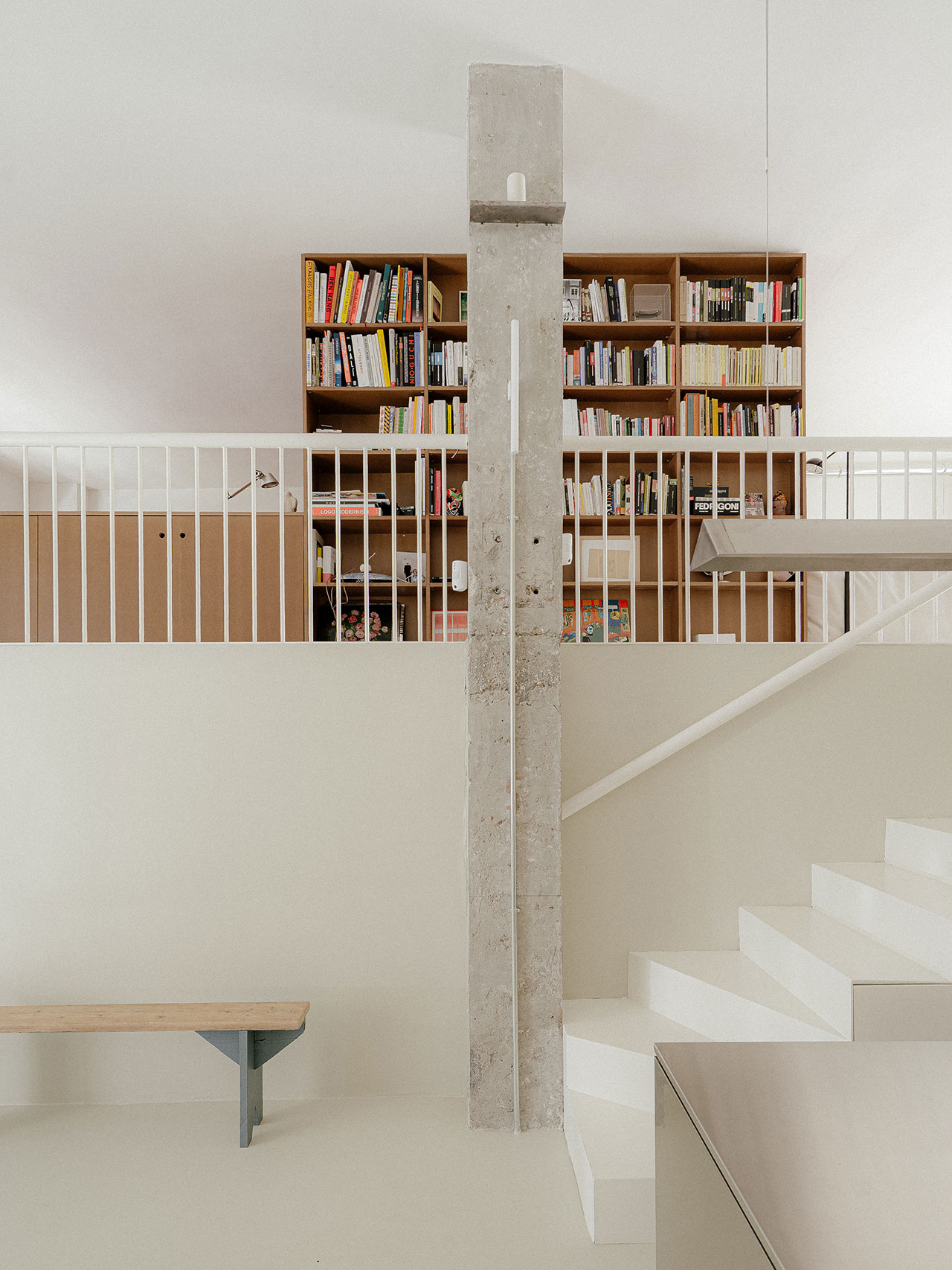 A restrained color palette enhances the project’s sense of calm. Smooth white surfaces bounce light, making the modest footprint feel more expansive. Against this backdrop, a central wooden structure introduces warmth and texture upstairs – an integrated system of wardrobes and bookshelves, along with a private full bathroom, separates the bedroom area from the living room.