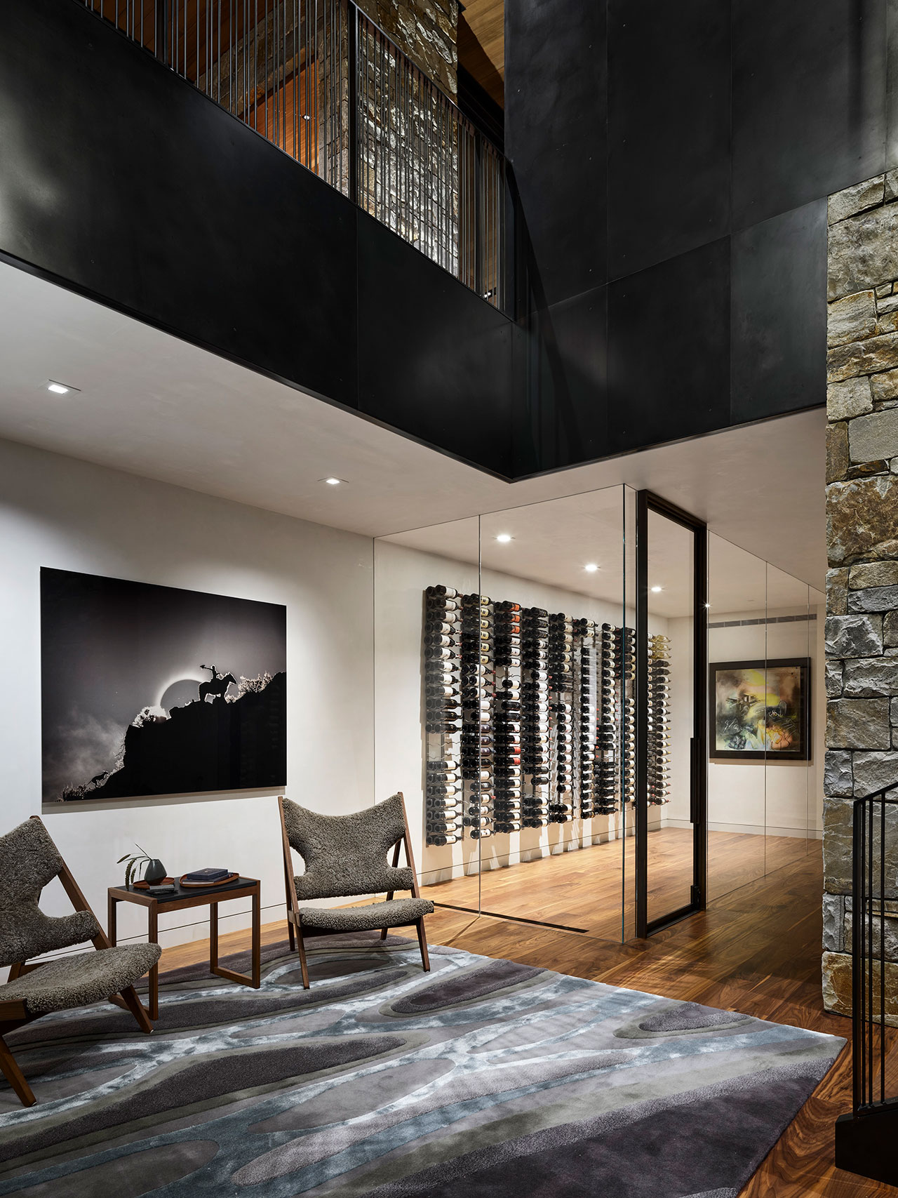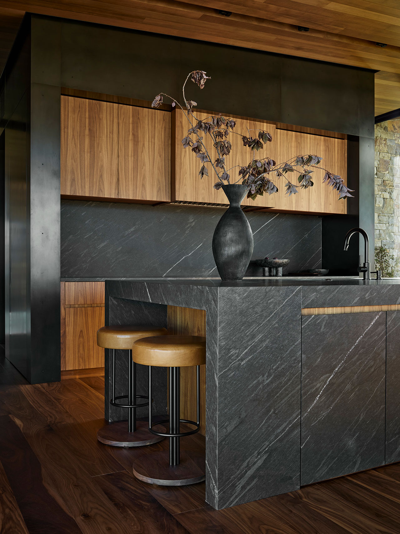 Stone sourced from Montana wraps the exterior and continues indoors, dissolving the boundary between interior and landscape. Warm cedar ceilings and walnut millwork add richness to the home, while blackened steel panels lend a refined edge to fireplaces and built-ins. These material choices echo the surrounding environment and reinforce the balance of tradition and modern detailing.