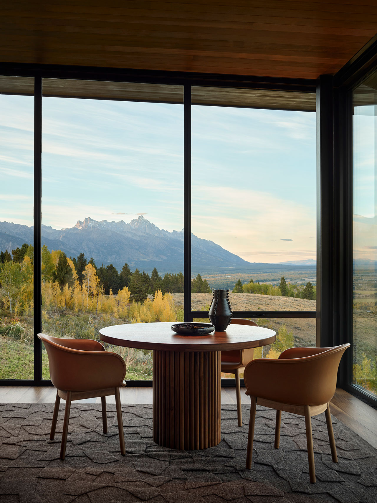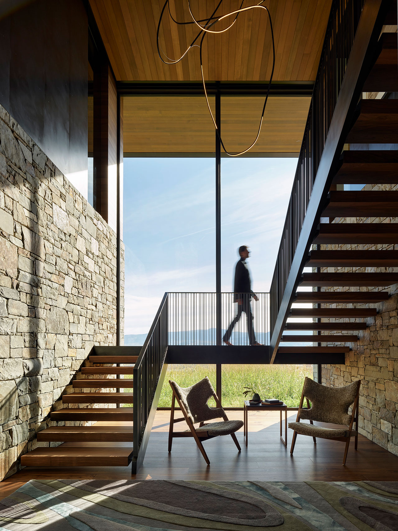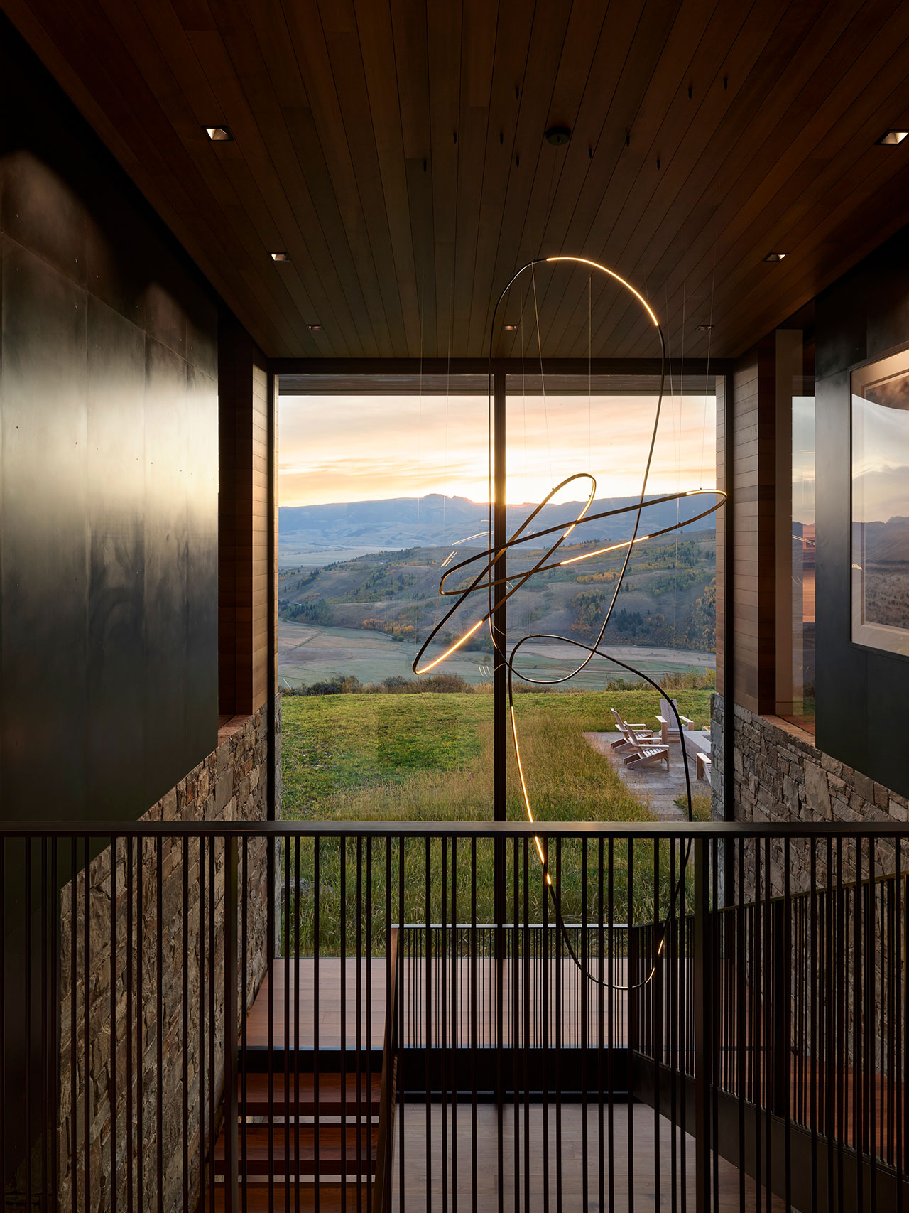 From the architectural elements to the smallest details, craftsmanship defines the project. A curving light sculpture illuminates the entry stairwell, a hand-crafted dining table anchors family gatherings, and custom rugs give nod to the topography of the Snake River Valley. Even lighting fixtures were designed to reference regional features such as rivers and lasso loops.