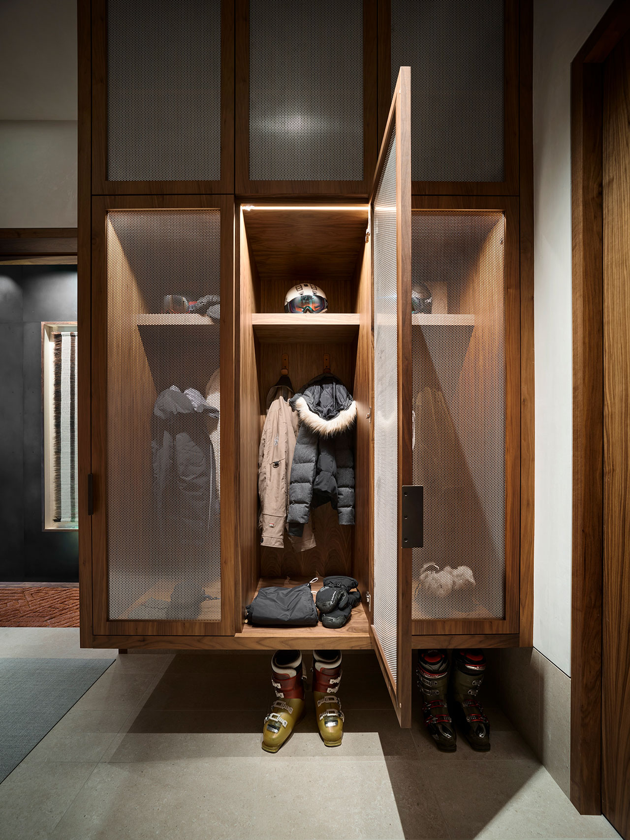 “We combined natural materials like leather, wood, and stone with custom furniture that relates to details throughout the interior architecture,” says Sarah Kennedy, interior designer at CLB. “We incorporated rich cedar and walnut to connect with a traditional aesthetic, but played off these luxurious textures with more refined, modern details.”
