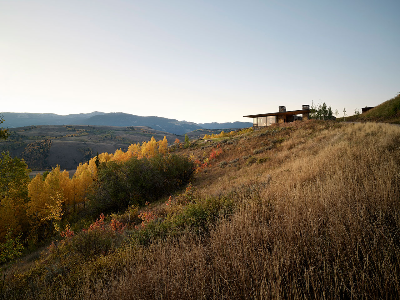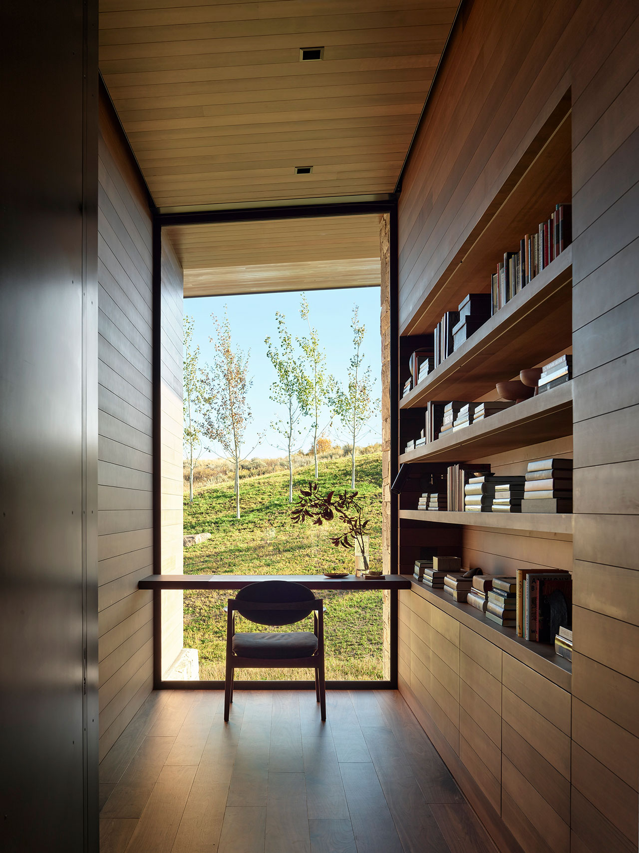 Inside, the designers leaned into a cozy, inviting approach in lieu of the Scandinavian-inspired trends that have been prevalent in modern home design for years. The interior color palette embraces earthy tones, including sage greens, ochres, and burnt orange tones that evoke the shifting hues of the Wyoming landscape. This grounding palette ensures that the views remain the main focal point of the residence.