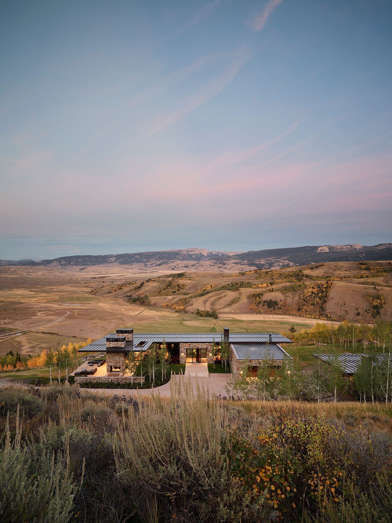 The project was rooted in collaboration. “Our relationship with the homeowner is a huge part of this story,” says Eric Logan, Partner at CLB. “Because of the trust and rapport that we built over the years, we were able to challenge each other and ultimately arrive at a design we all feel proud of,” says Eric Logan, partner at CLB. The homeowner, an East Coast native with a fondness for her stately New York residence, wanted something different for the family’s western escape – something more tactile, warm, and reflective of the rugged landscape. CLB responded with a design that embraces contrasts: protection and openness, quiet retreat and sweeping drama. As Logan notes, “You get to occupy the space between contrasts and enjoy them both. The house sits between the quiet, contemplative courtyard, and expansive views to the valley below.”